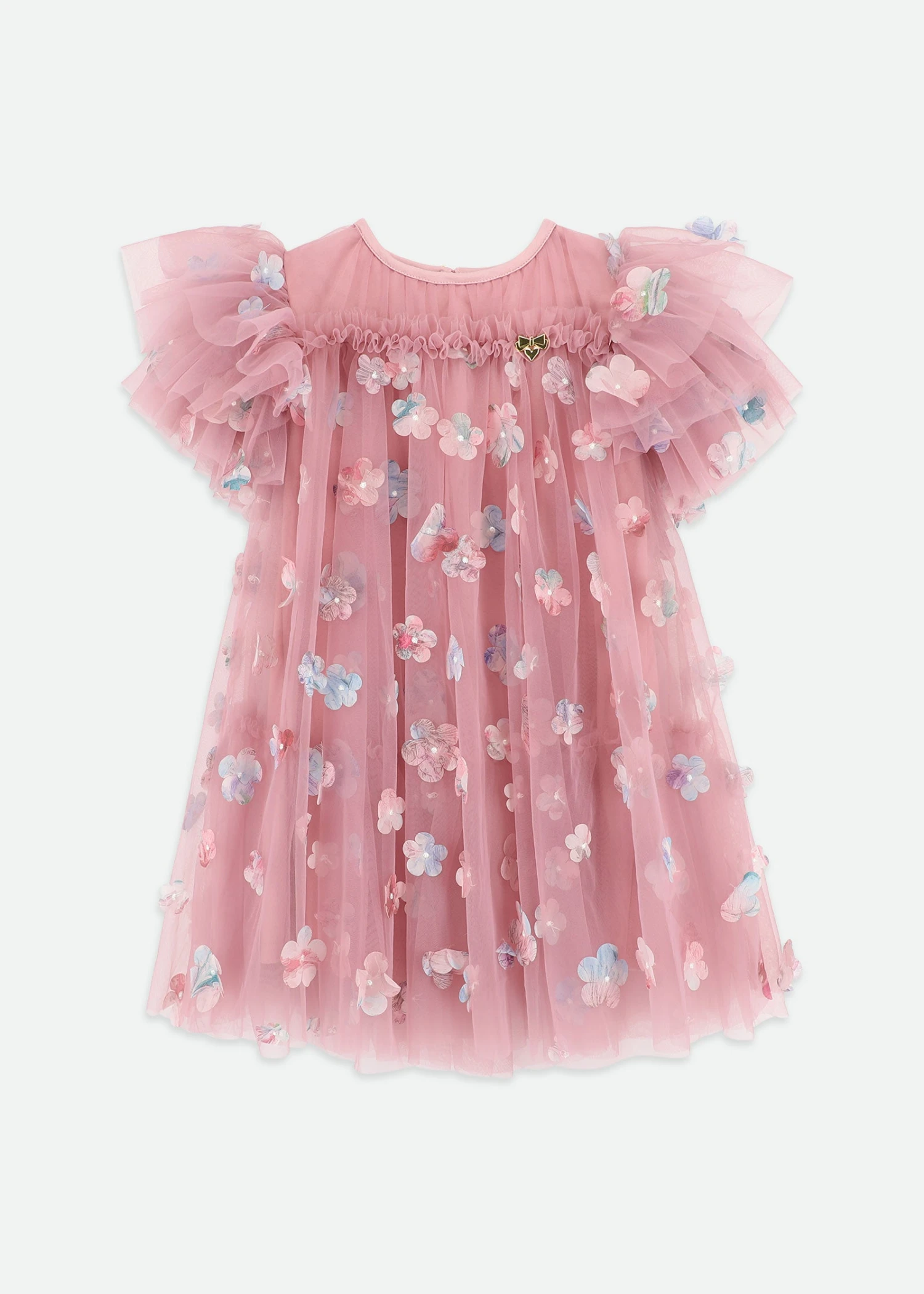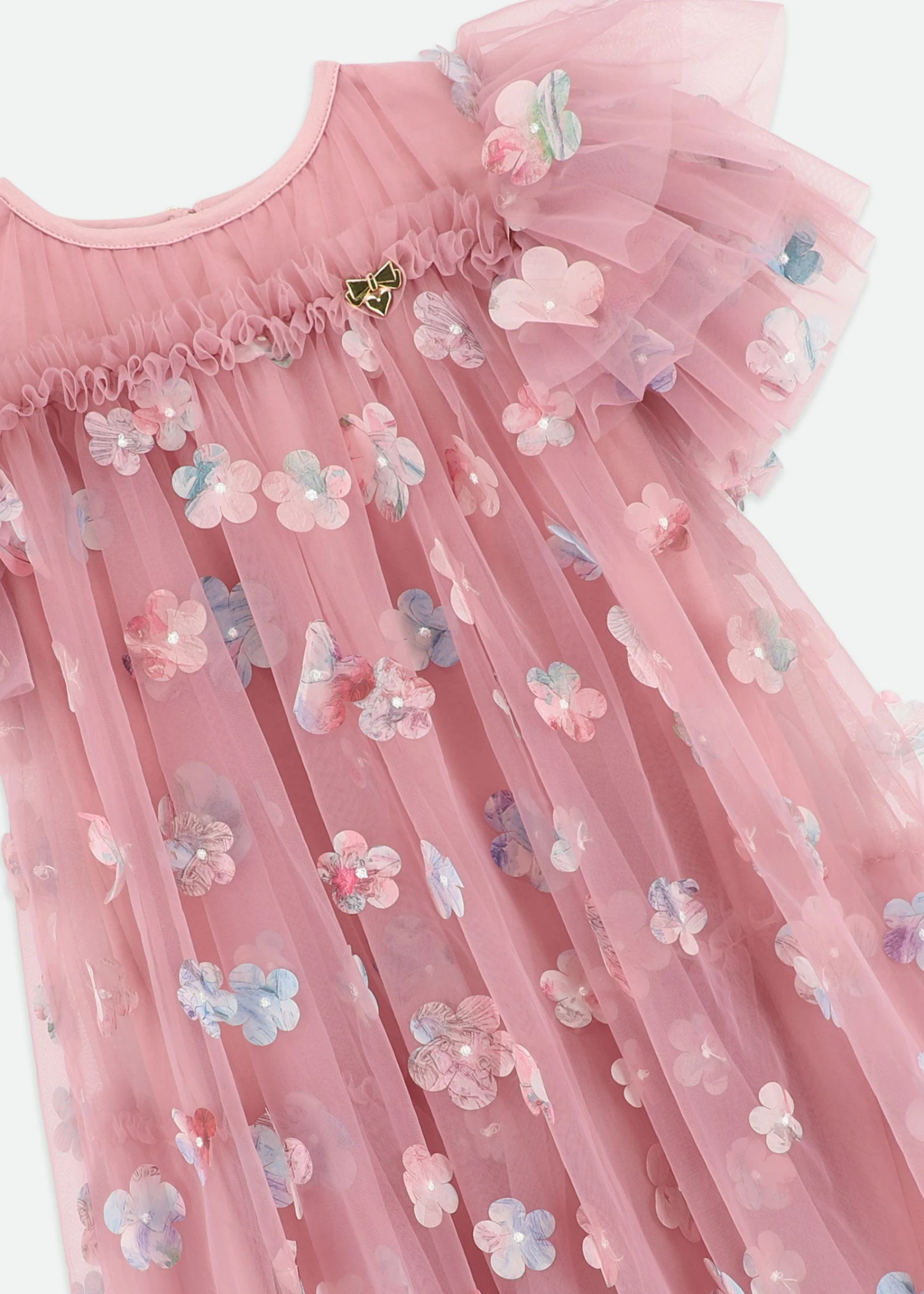 Feel like a fairy princess in this magical pink tulle dress for girls. Decorated all over with pretty 3D flowers that flutter with every twirl, this dress is perfect for parties and special occasions. It has soft ruffles across the chest and layered frill sleeves for extra charm. Fully lined in smooth cotton to keep you comfy. Finished with the Angel’s Face signature gold heart logo stud on the neckline and a button fastening at the back.