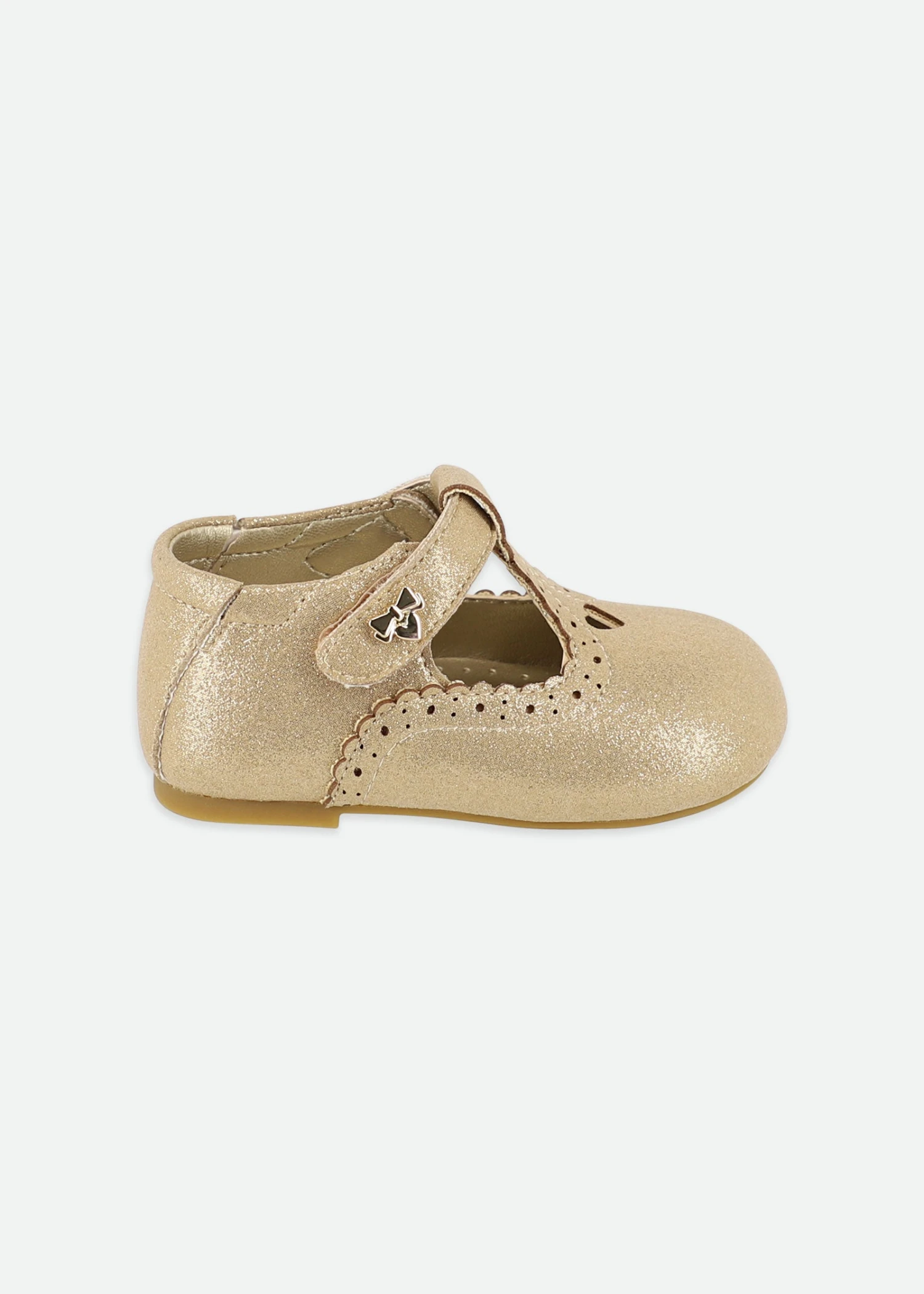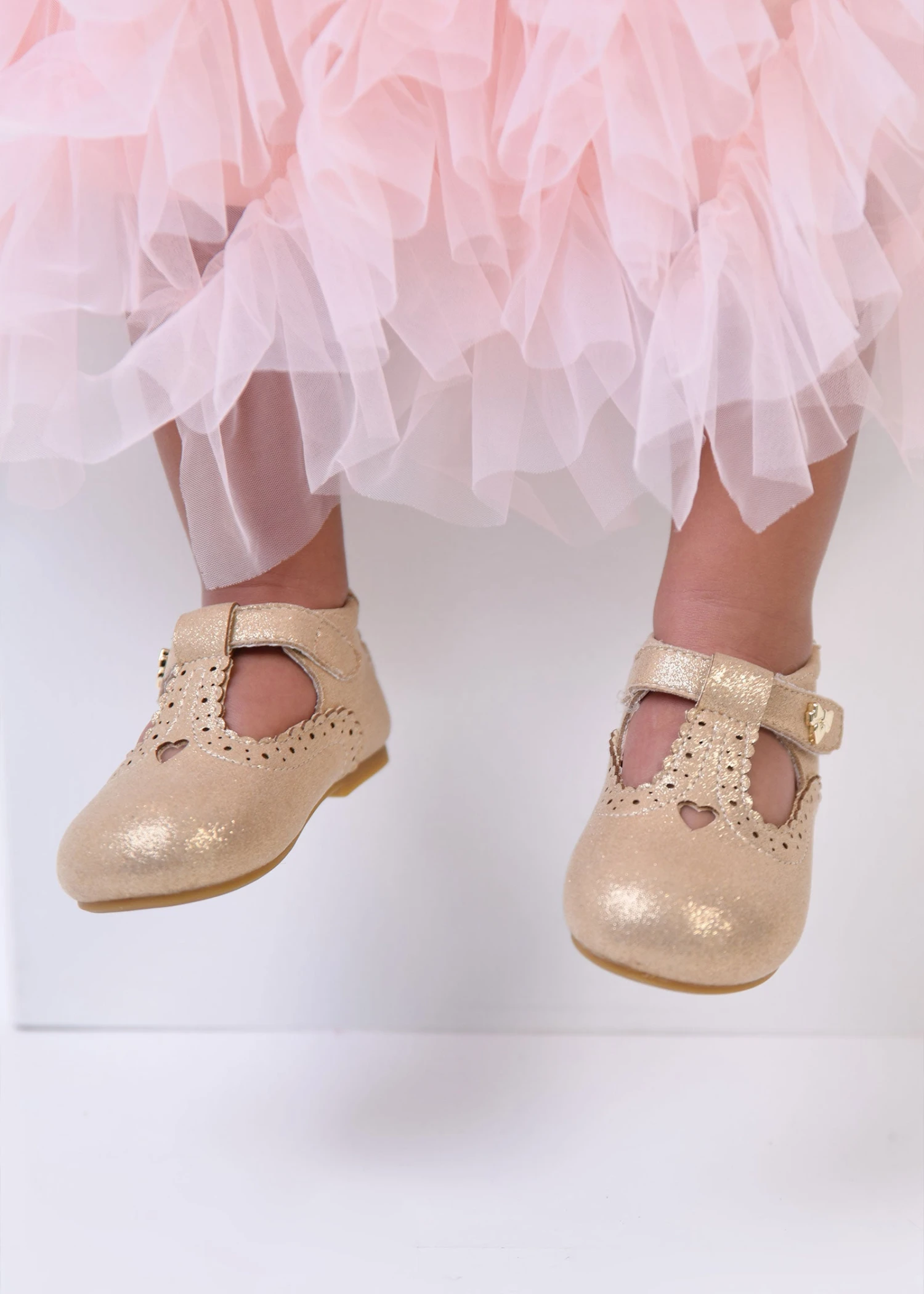Our traditional T-bar shoes are perfect for little ones learning to find their feet as they crawl. They are lightweight and have a flexible faux leather sole for extra comfort. Fastens with a velcro strap that features our logo stud. The shoe features a cute heart detail on the front.