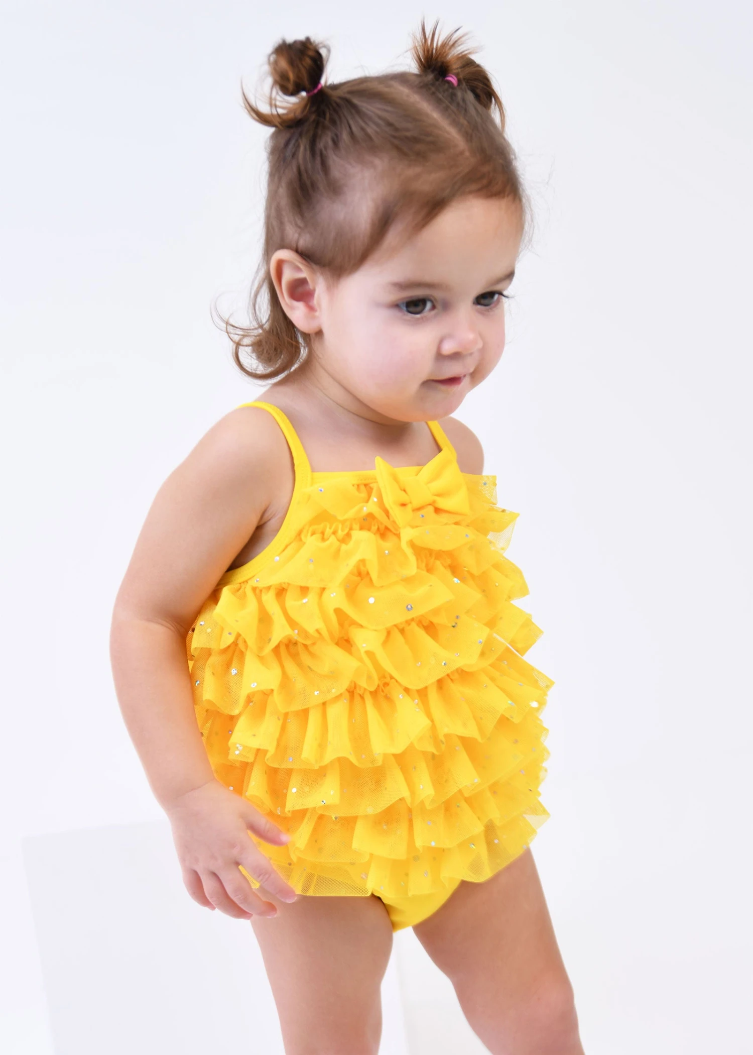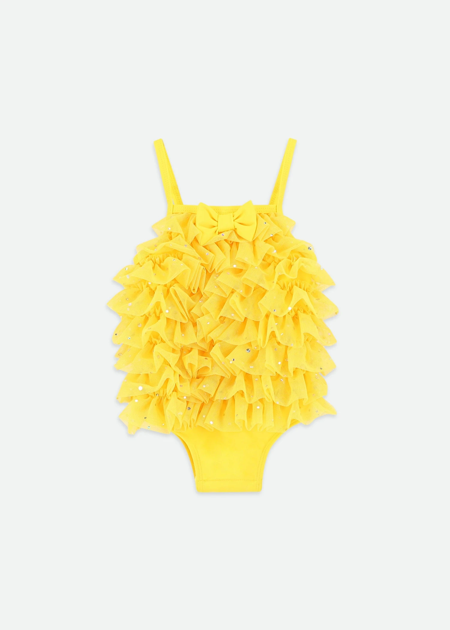 Adorable yellow swimsuit for baby girls. Detailed with tulle frills front and back, complete with a decorative bow on the neckline. Swimwear fully lined and made from SPF 50 fabric for optimum sun protection and fastens at the crotch with poppers.