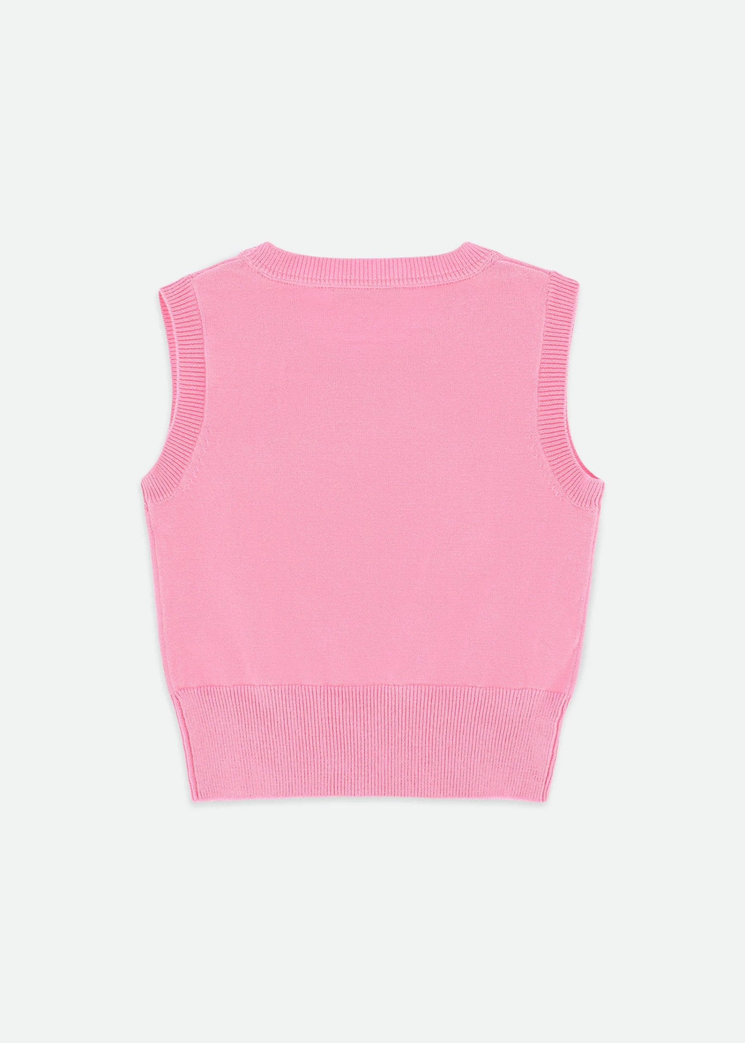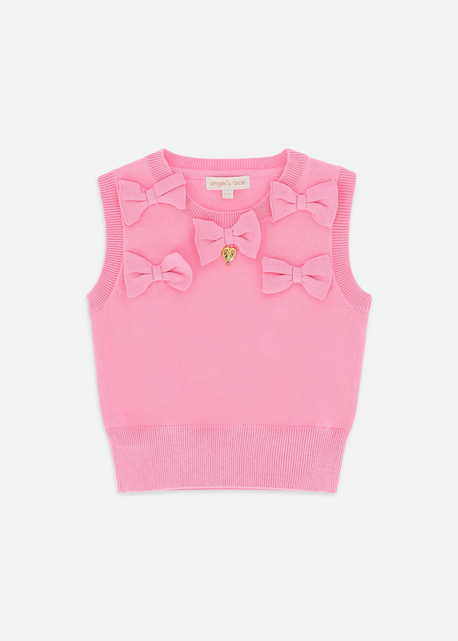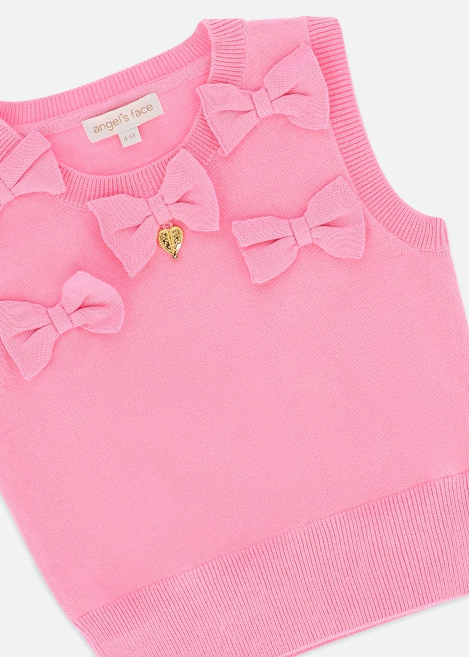 Girls fine knitted cotton blend pink sleeveless top. Round neck with bow details and our signature gold heart charm in the centre.