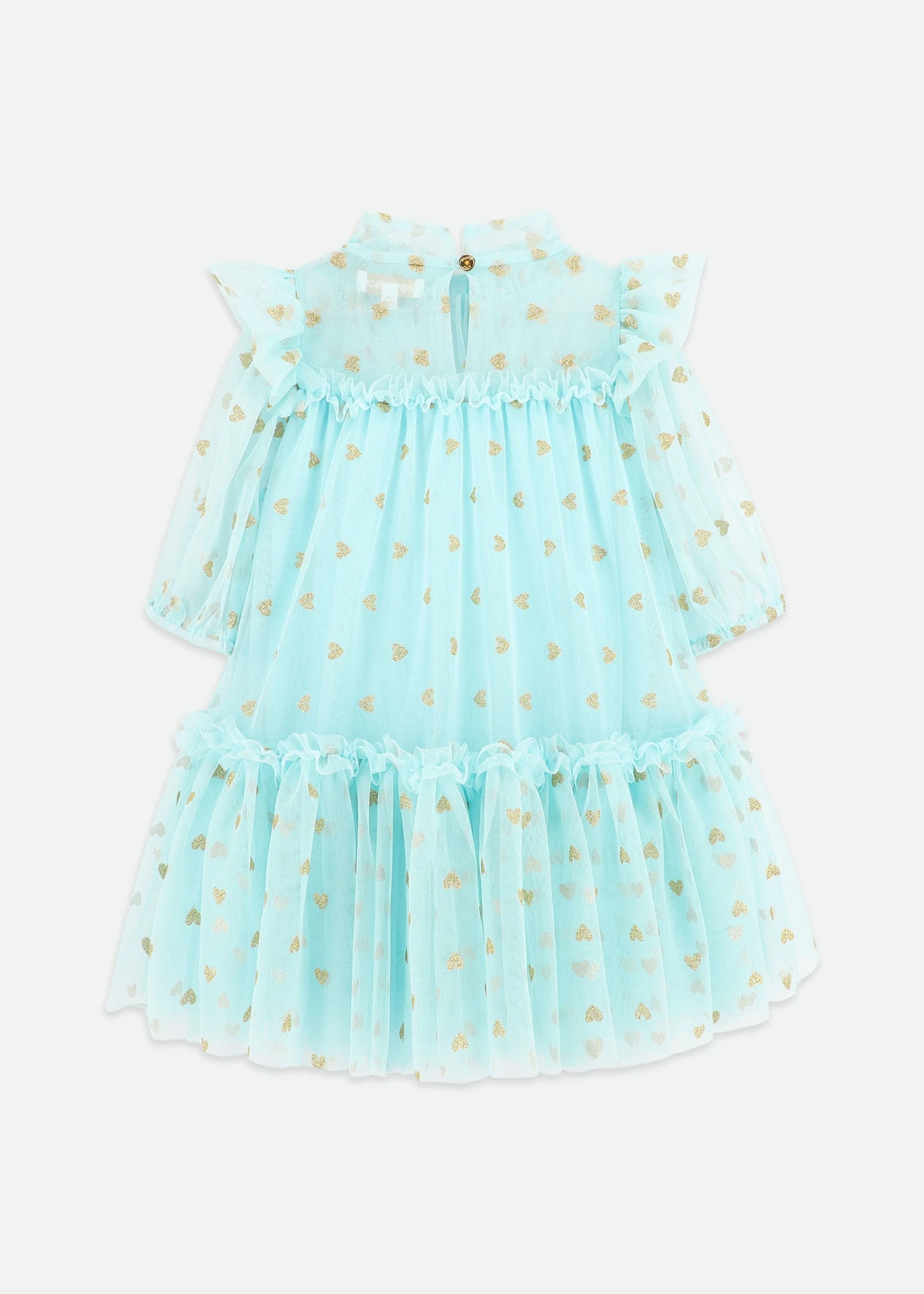 Make an entrance in this aqua soft tulle dress with little gold glitter hearts. This voluminous tulle dress is perfect for parties or special days. Three-quarter sleeve, frills at the neck yoke and skirt. Fully lined in a soft stretch cotton blend. The dress is complete with our signature bow and gold heart charm on the neckline, fastening at the back with a gold button.