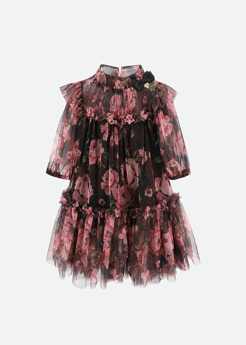 Make an entrance in this voluminous tulle party dress for girls. The luxurious tulle dress is detailed with this season’s exquisite flower design, fully lined in a soft stretch cotton blend. The dress is complete with our signature bow and gold heart charm on the neckline, fastening at the back with a gold button.