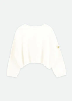 Fine knitted cotton blend gold cardigan with a touch of sparkle. Round neck cardigan which fastens down the front with gold buttons. The delicate gathers on the sleeves and shoulders make this the perfect piece to wear over any dress. Ribbed detail on the cuffs and hems and finished with two of our signature bows and gold heart studs above the waist.