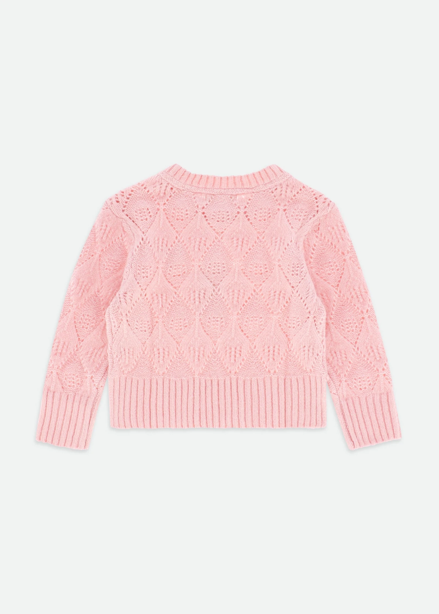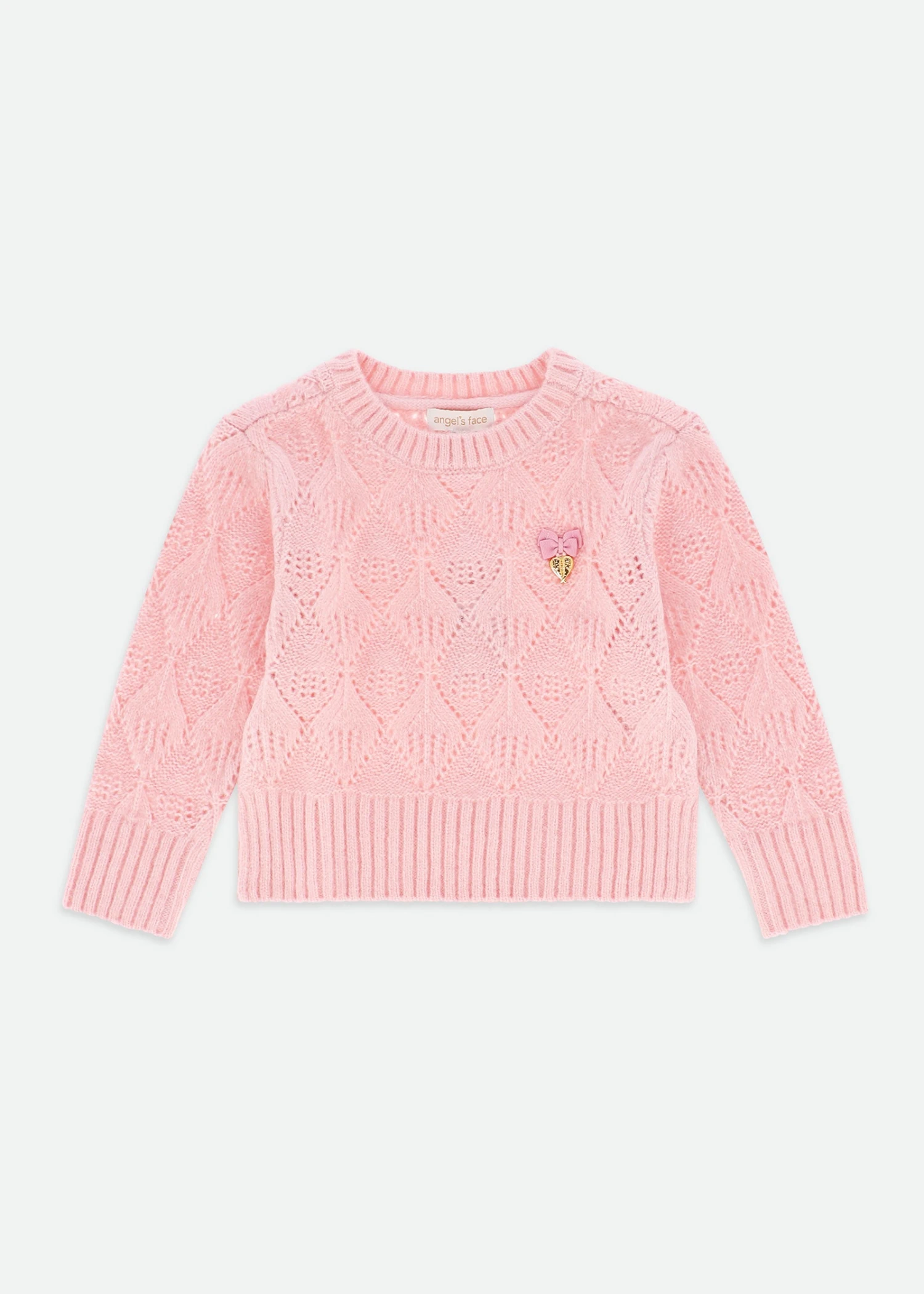 Adorable diamond pointelle knit Jumper for girls. Jumper is made from the softest chunky knit in blue. Detailed with a deep rib hem featuring our signature bow and gold heart charm on chest.