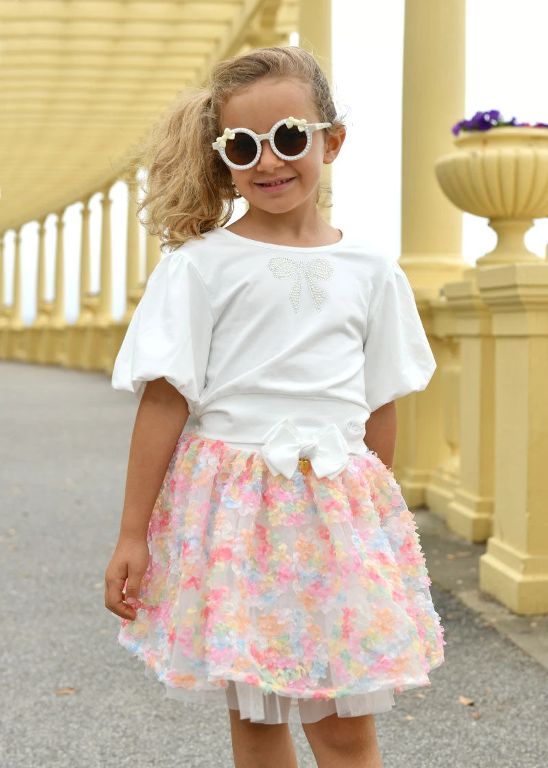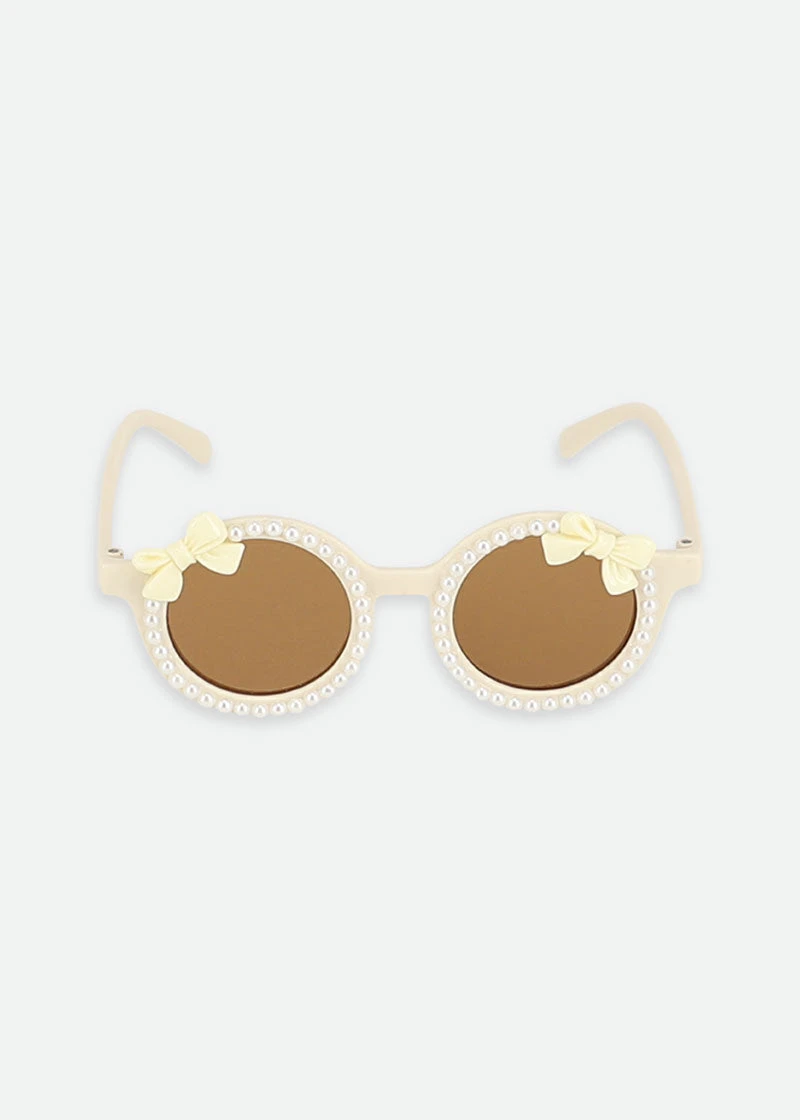 Stylish sunglasses for girls in snowdrop white. The circle frame features a bow, gorgeous pearl detailing, and the Angels Face logo on the arm. Each pair comes in a luxurious pink case and has full UV protection to protect delicate little eyes.