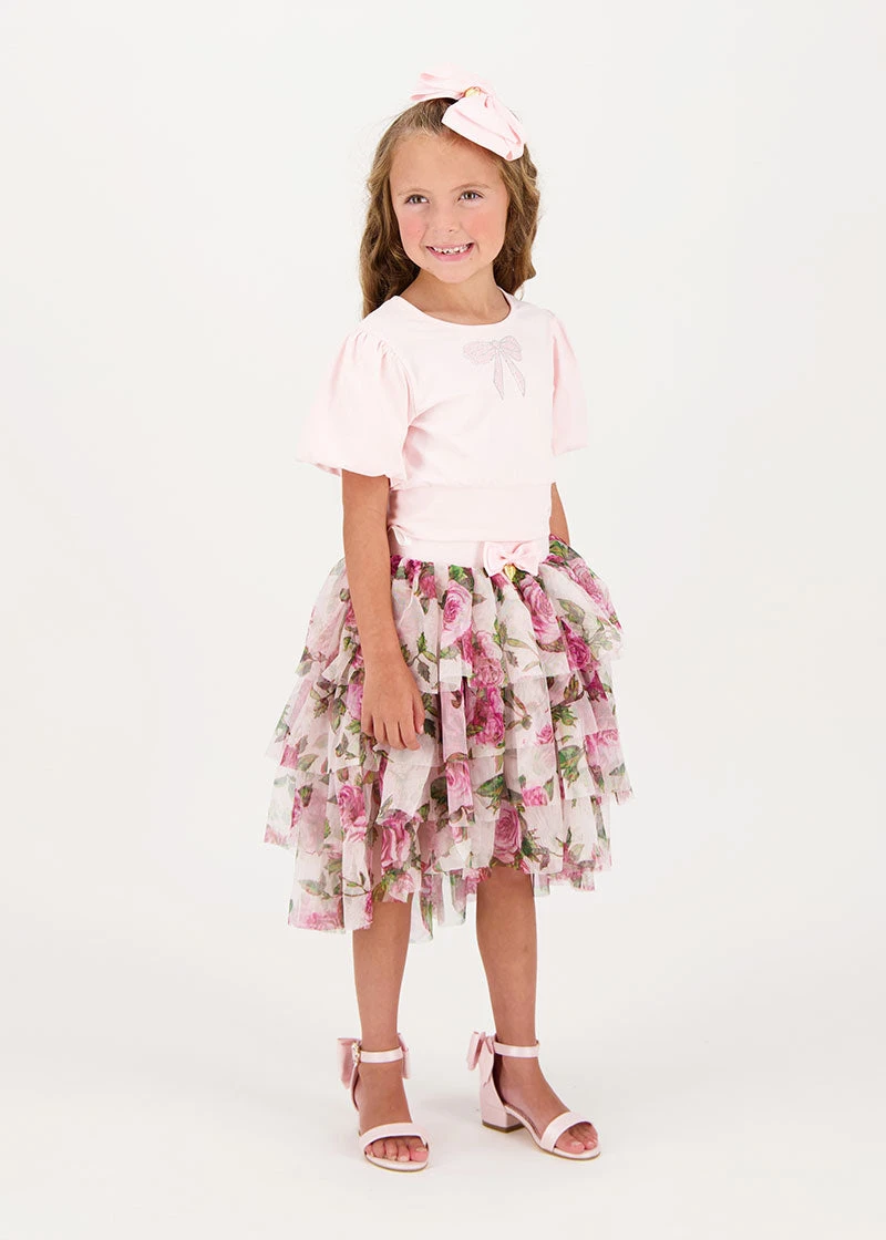 Super soft voluminous tulle skirt in a pink flower design/ the skirt has tiers of flower tulle with a dipped hem at the back. Waistband and lining made soft stretch cotton blend complete with our signature bow and gold heart charm on the waist.