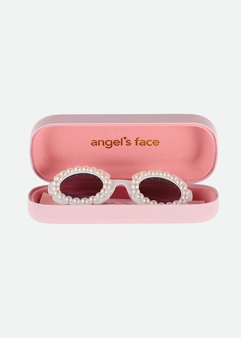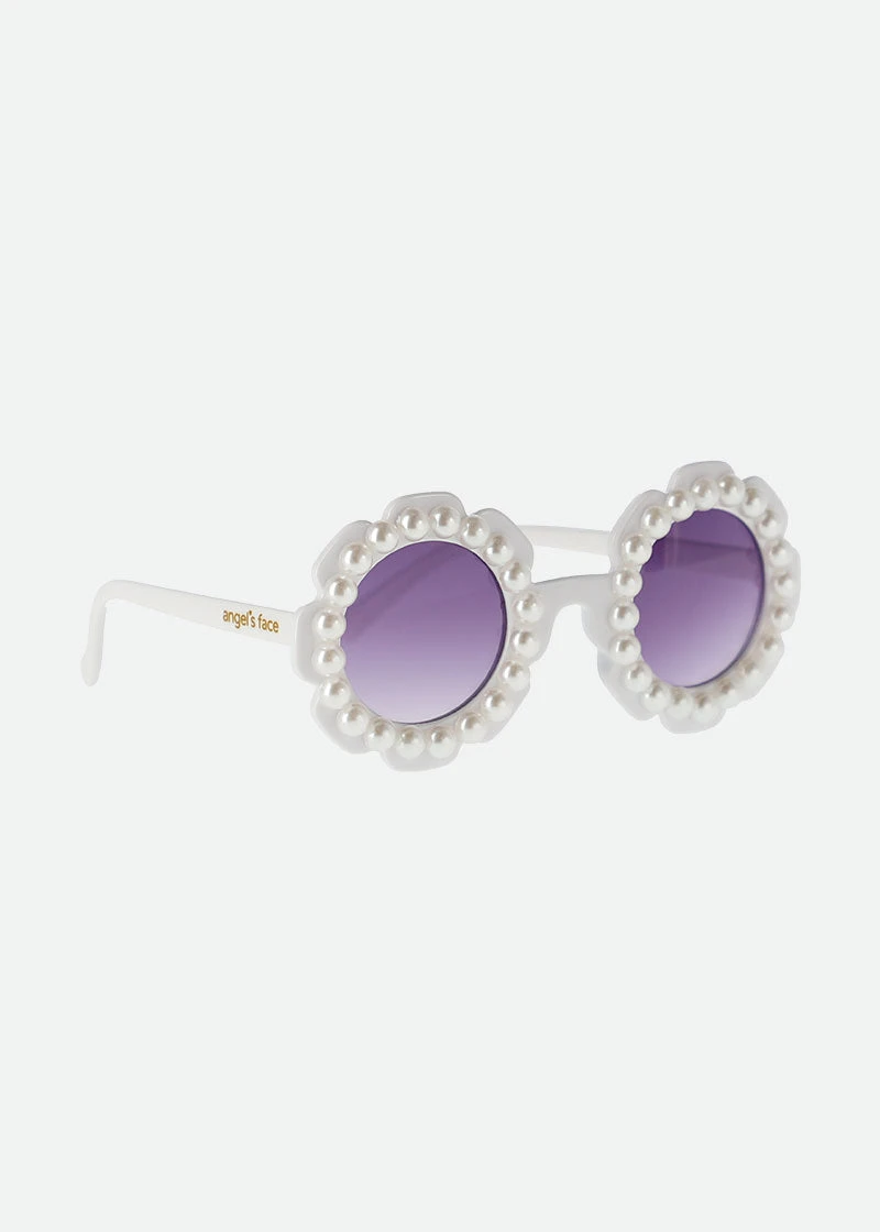 Stylish white sunglasses for girls. The flower shaped frame features gorgeous pearl detailing and the Angel’s Face logo on the arm. Each pair comes in a luxurious pink case and have full UV protection to protect delicate little eyes.