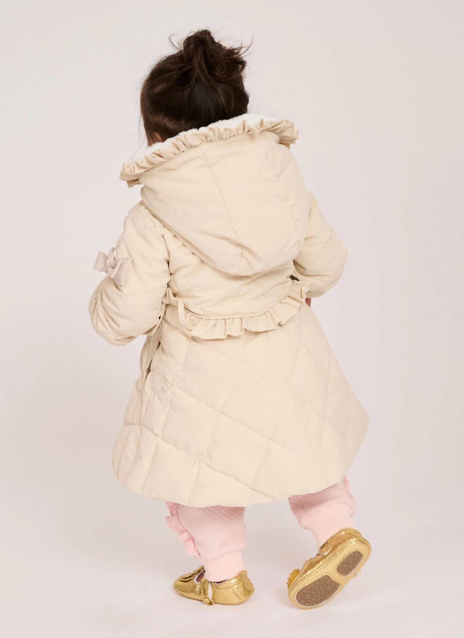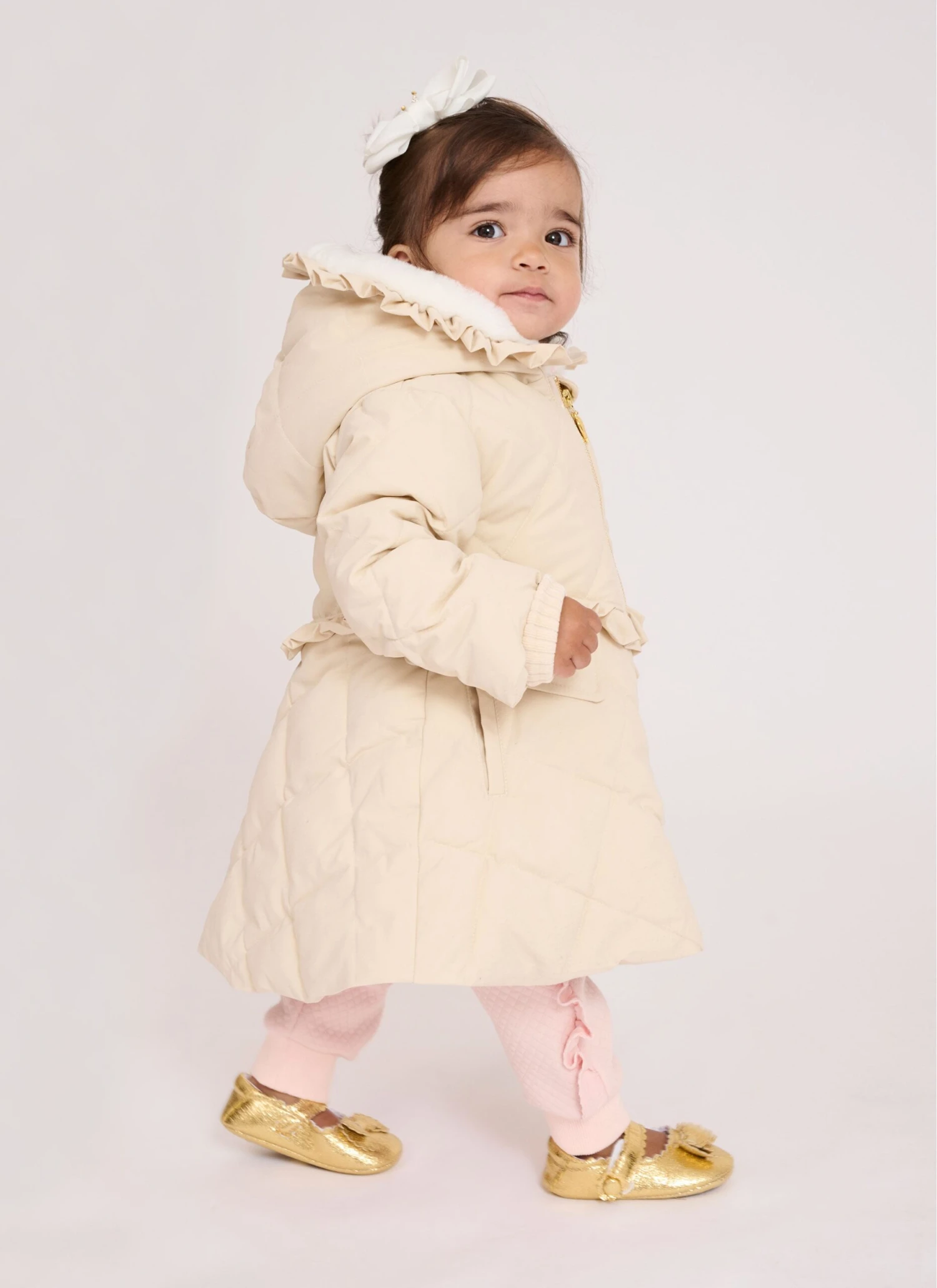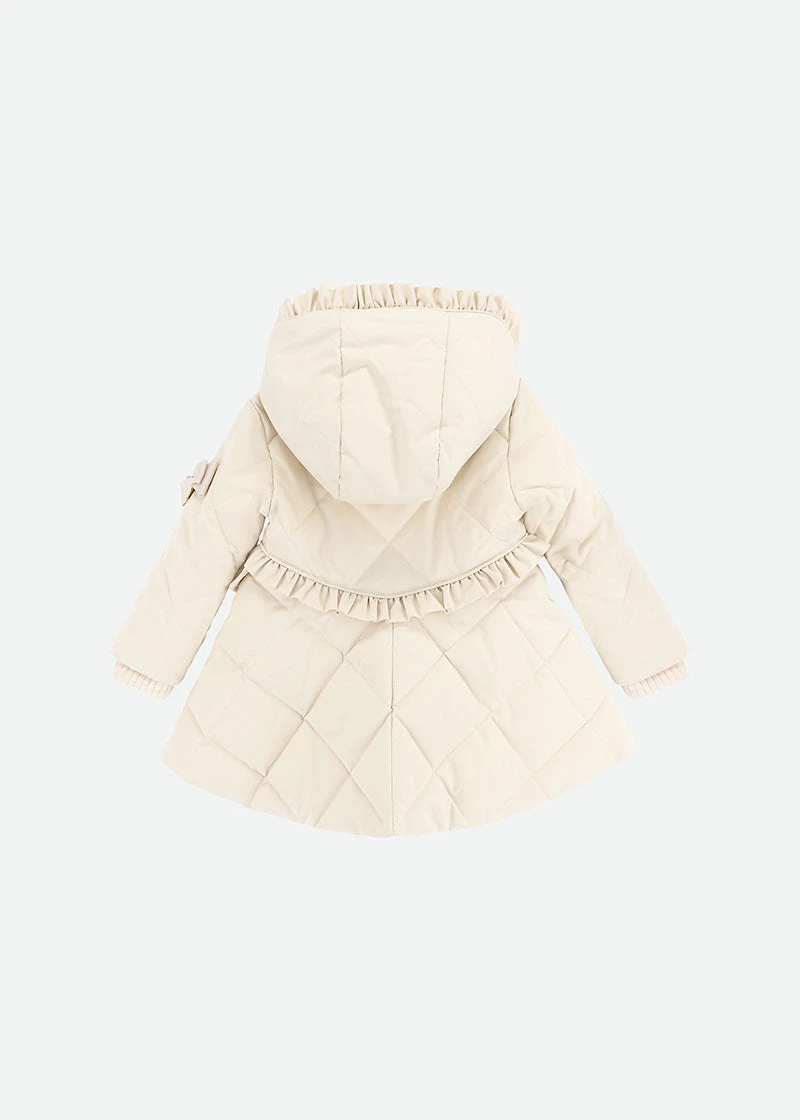 Gorgeous champagne beige winter coat for baby girls. The coat is padded with a diamond quilt design, fully lined in silky soft satin featuring luxuriously soft faux fur in the hood. Pretty ruffles feature around the waist and hood, fastening at the front with easy zip and a gold heart puller. The coat is complete with our signature bow on the sleeve.