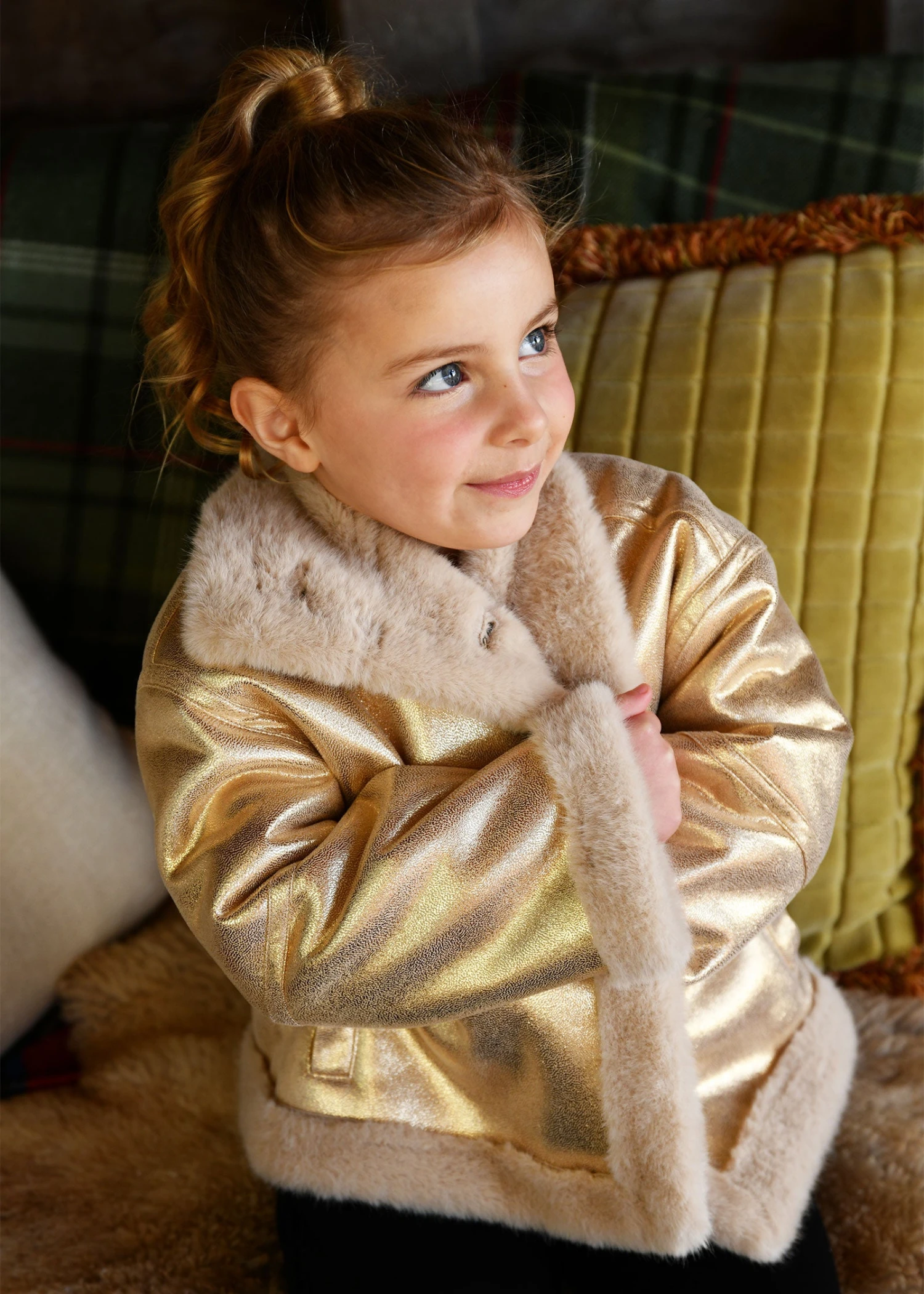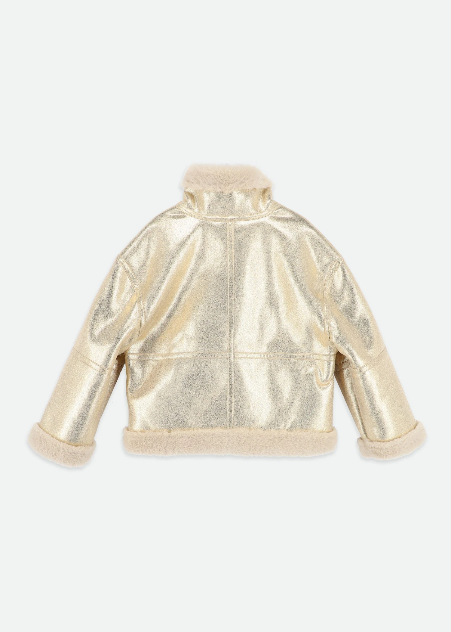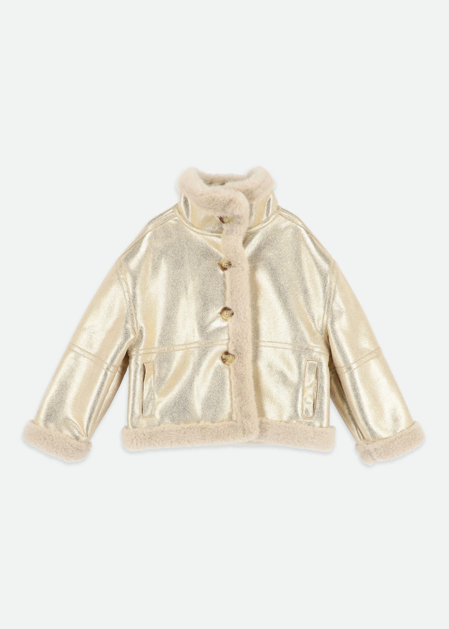 Our gorgeous metallic gold cropped jacket is lined and trimmed in super soft, warm plush faux fur. Adding a touch of glamour to any outfit, it has a wonderful shimmer and is finished with classic tortoiseshell button fastenings.