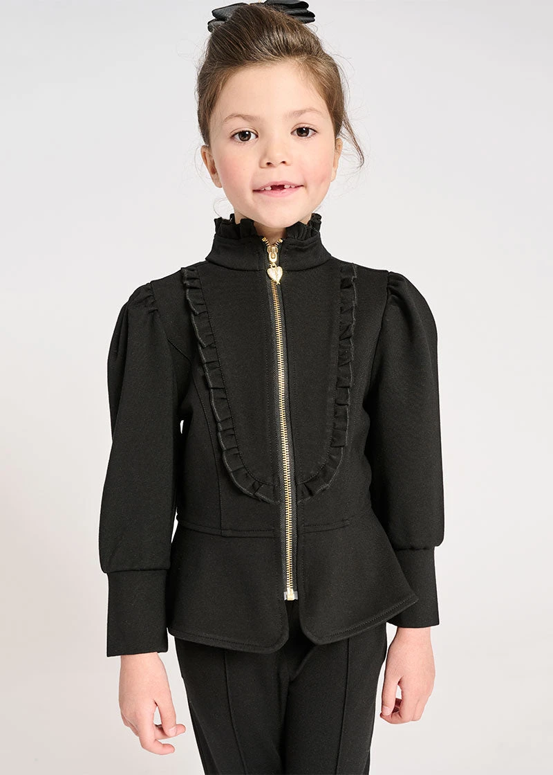 Phyllis is a beautifully cut, fitted jacket made in our gorgeous Ponte Roma fabric. The long-puffed sleeves and deep cuffs are enhanced by gathered shoulders. Bursting with detail pretty ruffles edge the collar and bodice bib, accompanied by an elegant peplum adorning the waistline. This unique jacket is completed with our iconic gold heart zipper down the centre front.