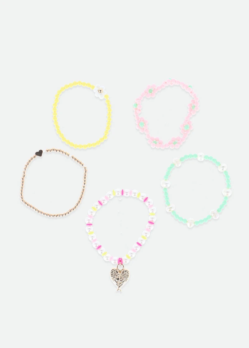 Pink Flower five pack bracelet set. Wear together or individually to suit your style, all bracelets are elasticated for easy wearing.