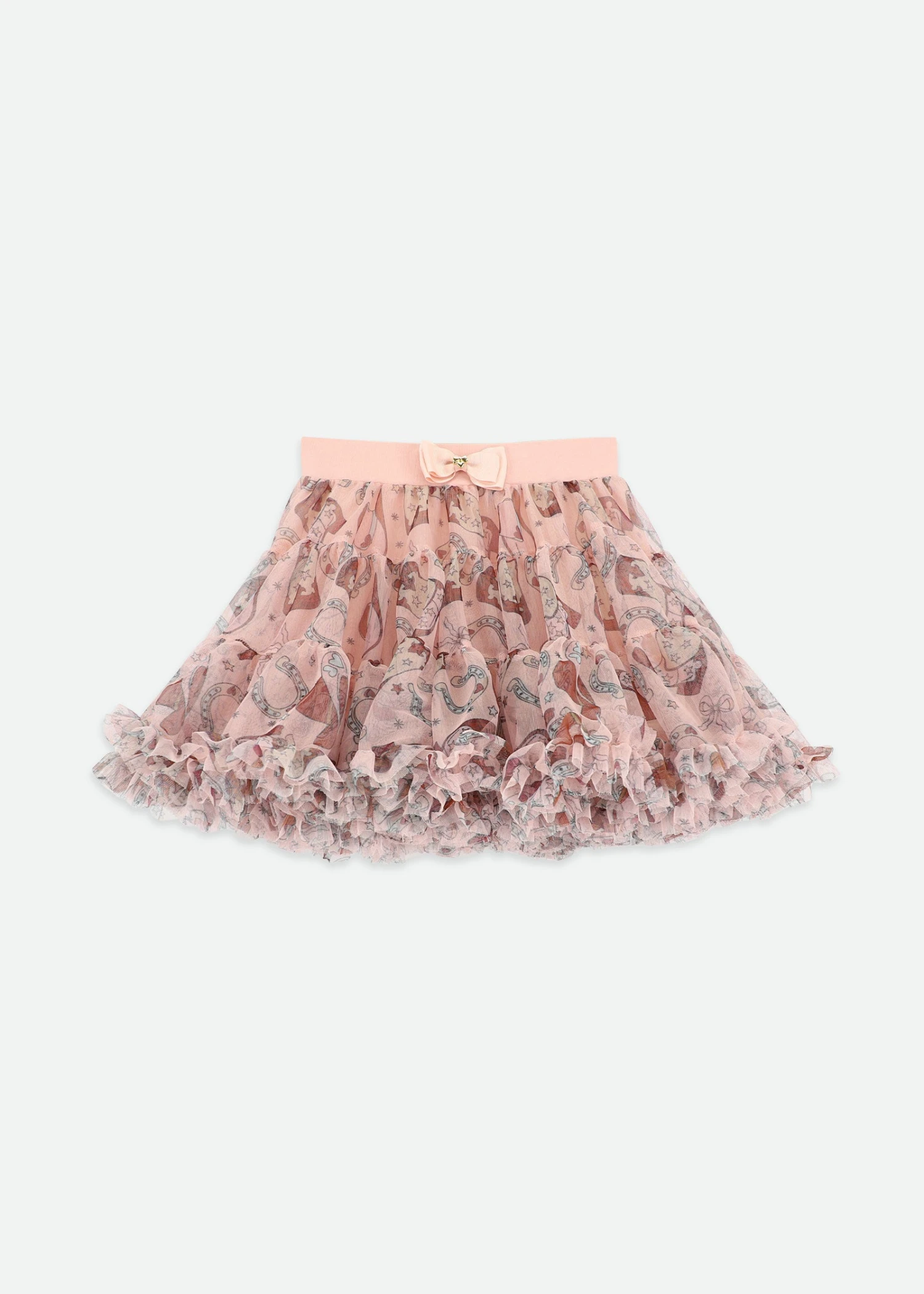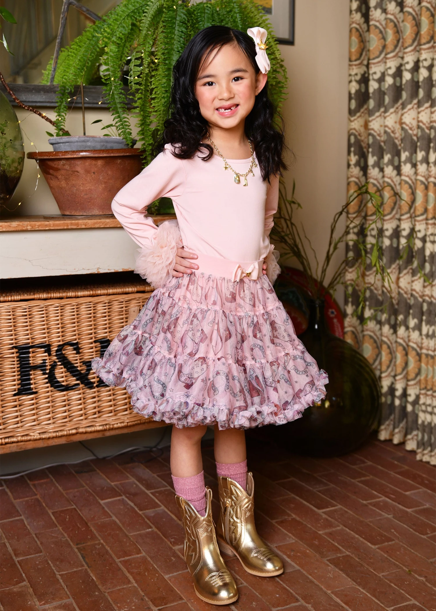 Made from endless yards of soft frills, this tutu is perfect for twirls, pirouettes and endless joyful adventures. All our Tutu Skirts are delivered in our beautiful vintage-inspired Angel’s Face hatbox. The Pixie tutu is now available in our iconic cowgirl print, with layers of soft tulle that are tiered and gathered at the hem and finished with a new large bow and heart charm detail. An elasticated waistband and cotton lining ensures for a secure and comfortable fit.