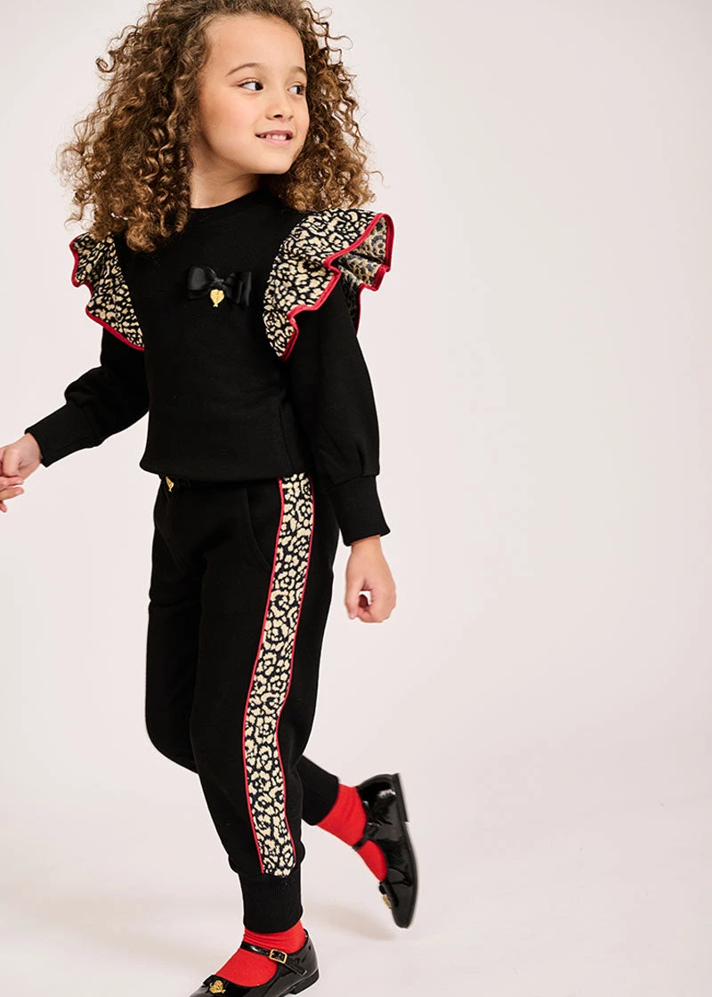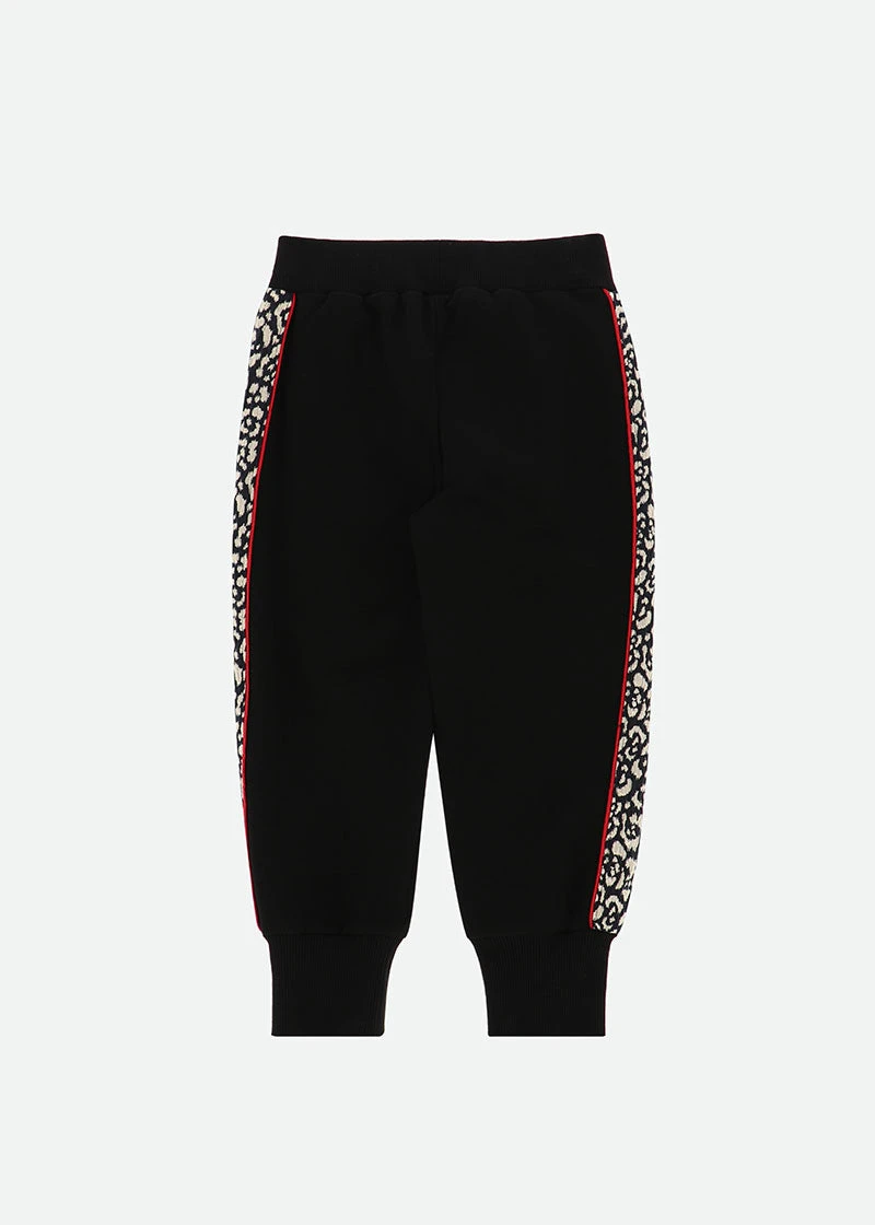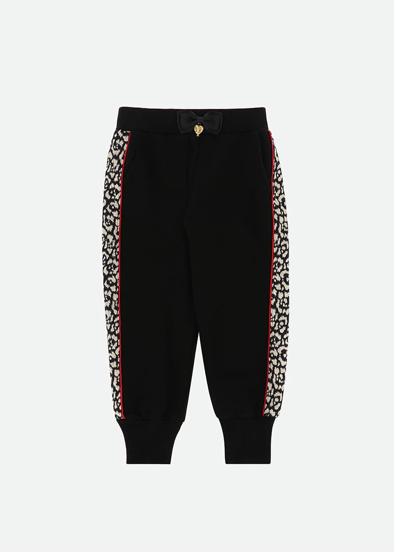Soft cotton loopback jogger detailed with black and gold jacquard side panel and contrast red piping. Joggers have soft stretch ribbed waistband and cuffs, complete in luxury with our signature bow and gold heart charm centre of the waistband.