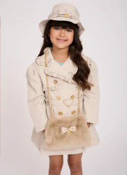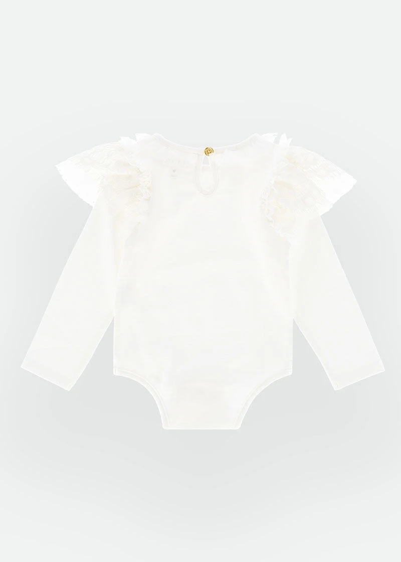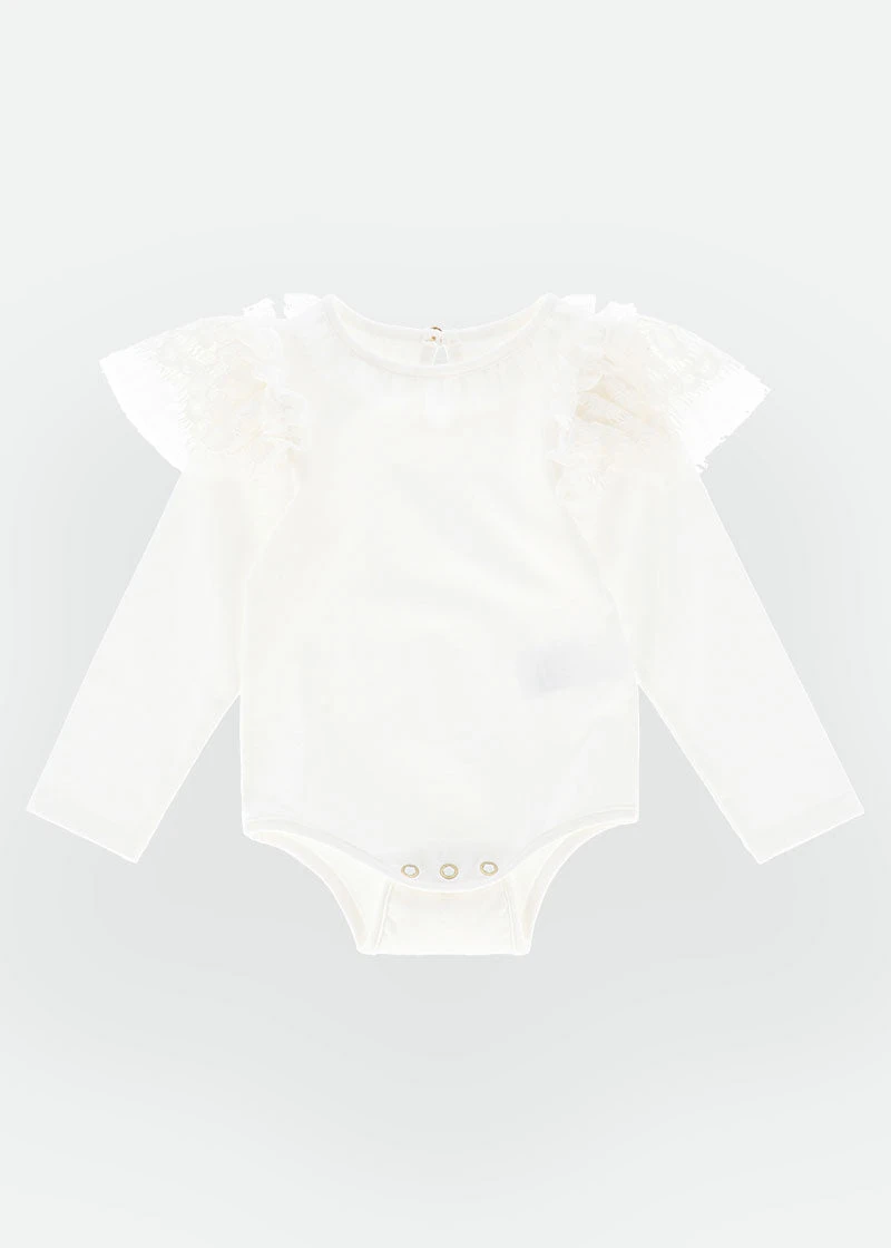 Comfortable long sleeve babygrow for girls in snowdrop white. Made from our softest stretch cotton babygrow features an adorable tulle ruffle around the neck and lace trim on the shoulders. Babygrow fastens at the crotch with poppers and at the back neck with a gold logo button.