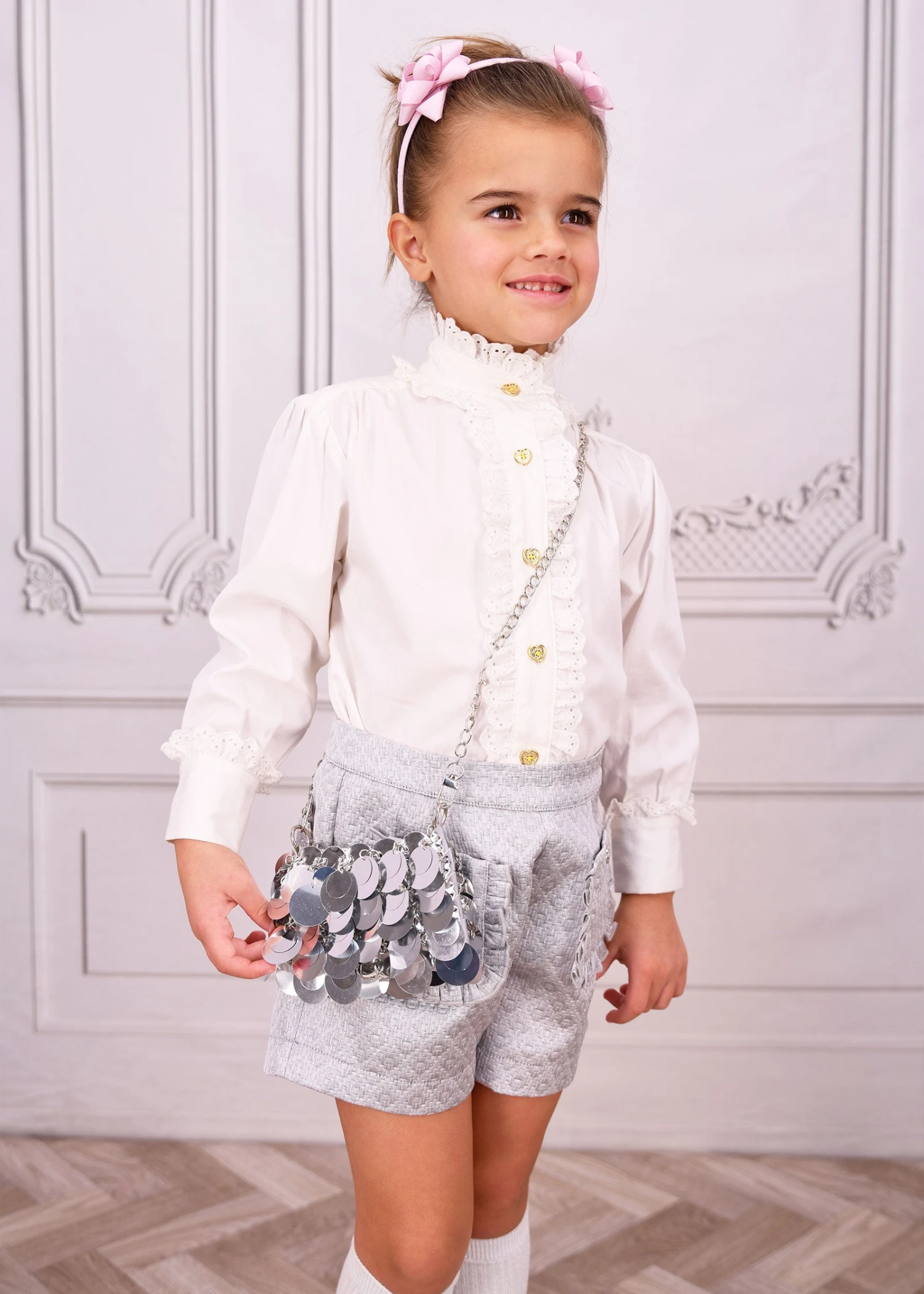 Our stand-out silver shoulder bag, made from mirror discs. This dazzling special occasion accessory has a mini zipped compartment suitable for small essentials. There is a detachable silver metal chain strap to carry on the shoulder.