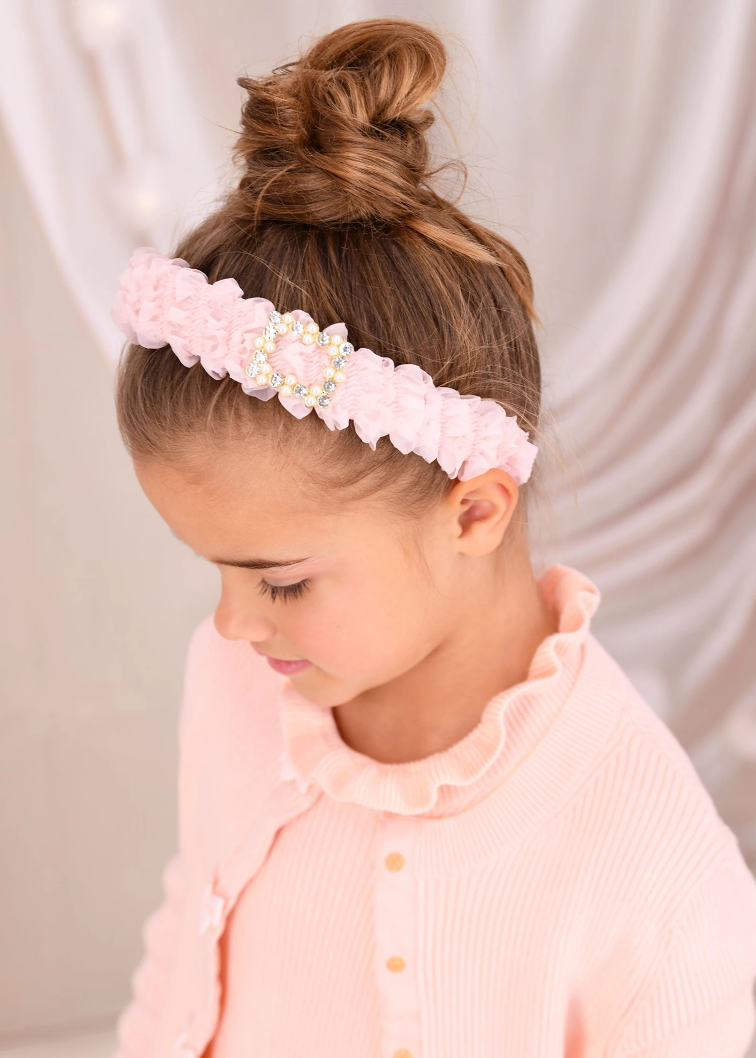 Eye-catching peach hairband with diamanté buckle for girls. The flexible, headband is simply and beautifully decorated with ruffled layers of tulle for a dramatic look. The perfect accessory to complete any Angel’s Face look.