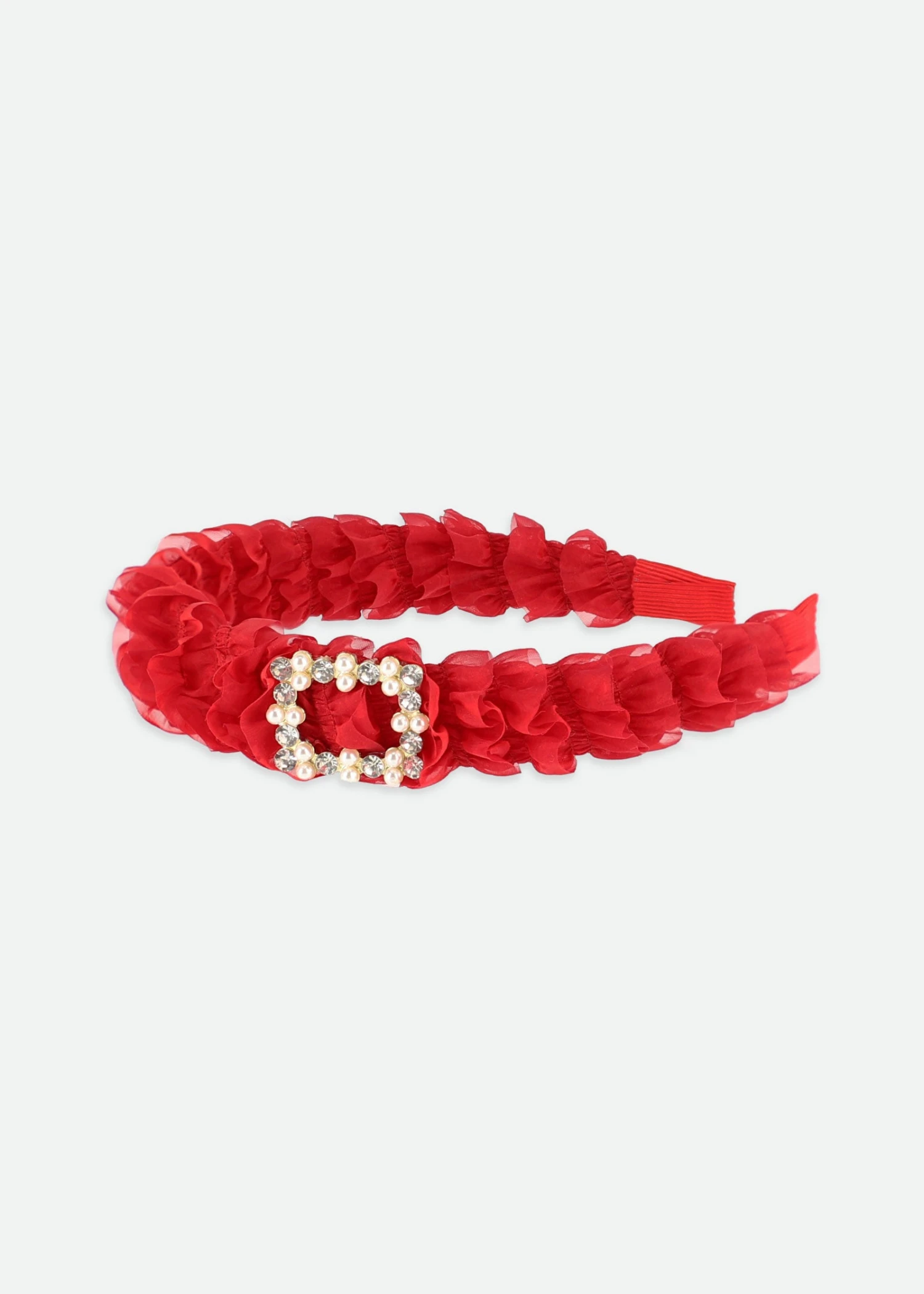 Eye-catching red hairband with diamanté buckle for girls. The flexible, headband is simply and beautifully decorated with ruffled layers of tulle for a dramatic look. The perfect accessory to complete any Angel’s Face look.