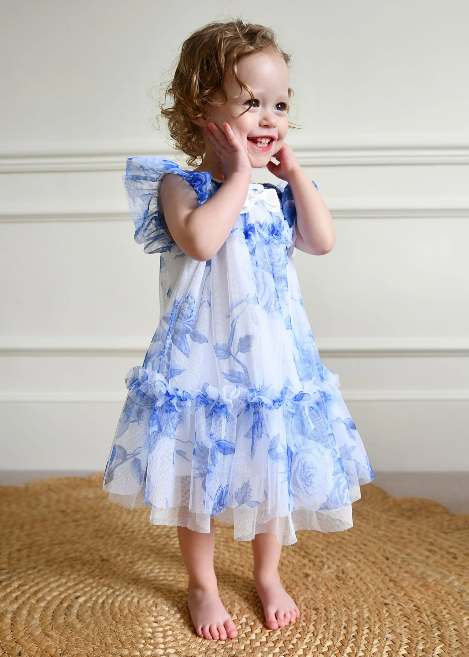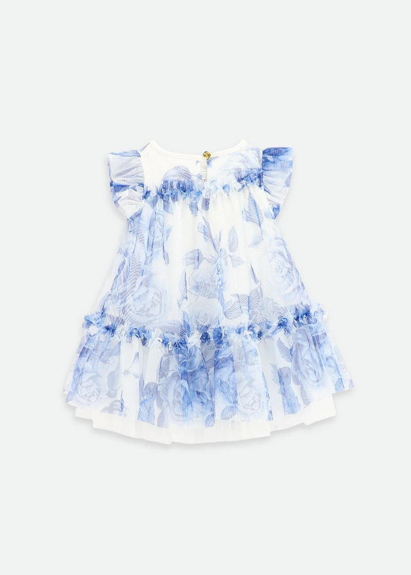 Voluminous tulle party dress for baby girls. This luxurious tulle dress is detailed with an exquisite flower design, fully lined in soft stretch cotton blend. The dress is complete with our signature bow and gold heart charm on the neckline, fastening at the back with a gold button.