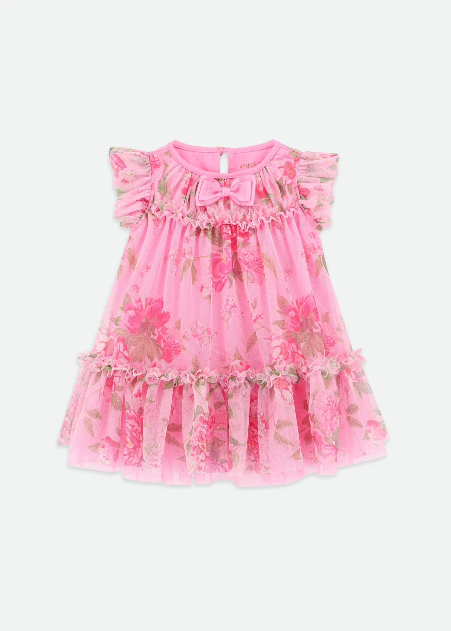 Voluminous tulle party dress for baby girls. This luxurious tulle dress is detailed with an exquisite flower design, fully lined in soft stretch cotton blend. The dress is complete with our signature bow and gold heart charm on the neckline, fastening at the back with a gold button.