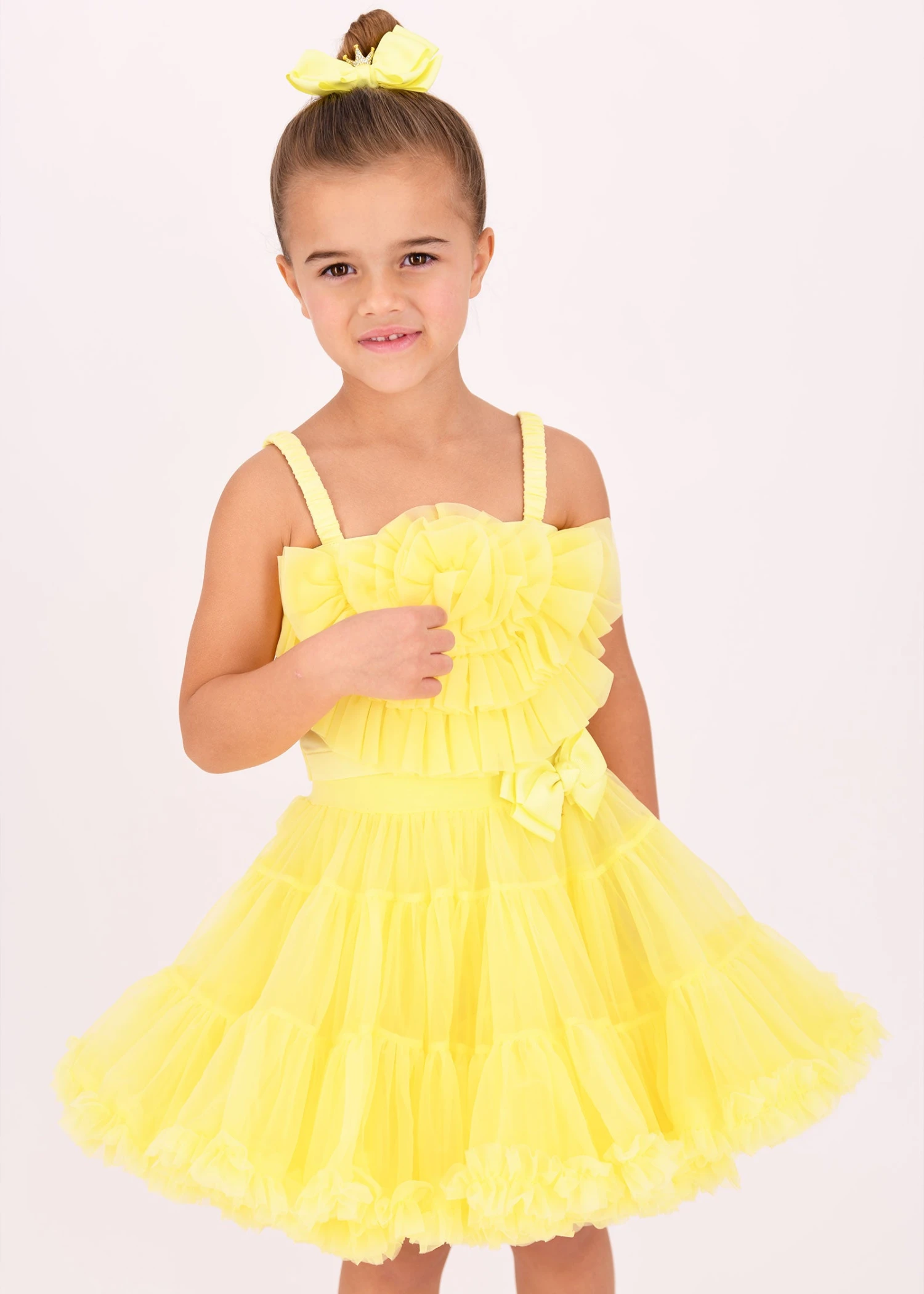 Cropped ruffle top in sherbet made from multiple layers of tulle lace. It has a pretty rosette design on the front and is colour-matched with our iconic pixie tutus in the same shade.
