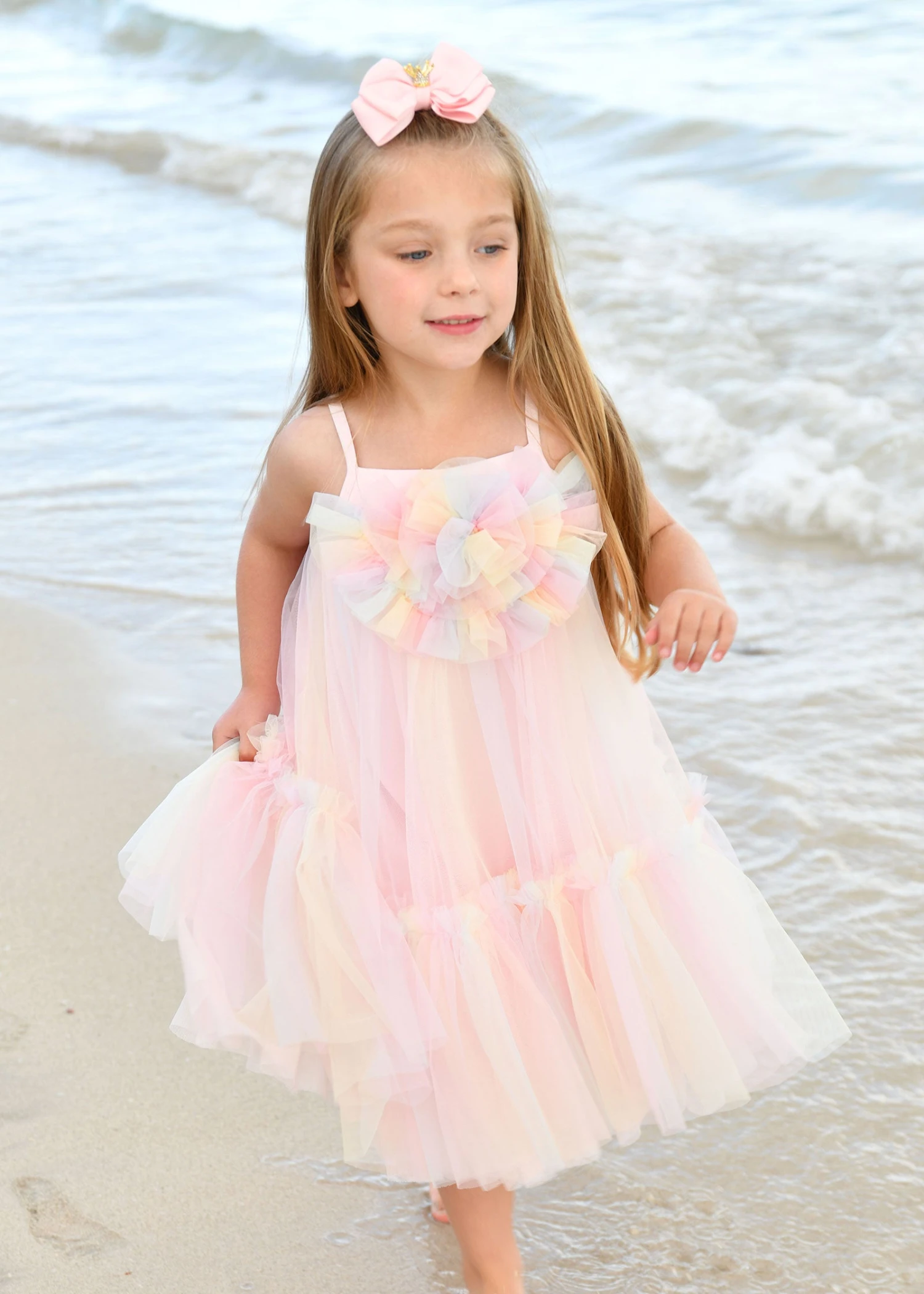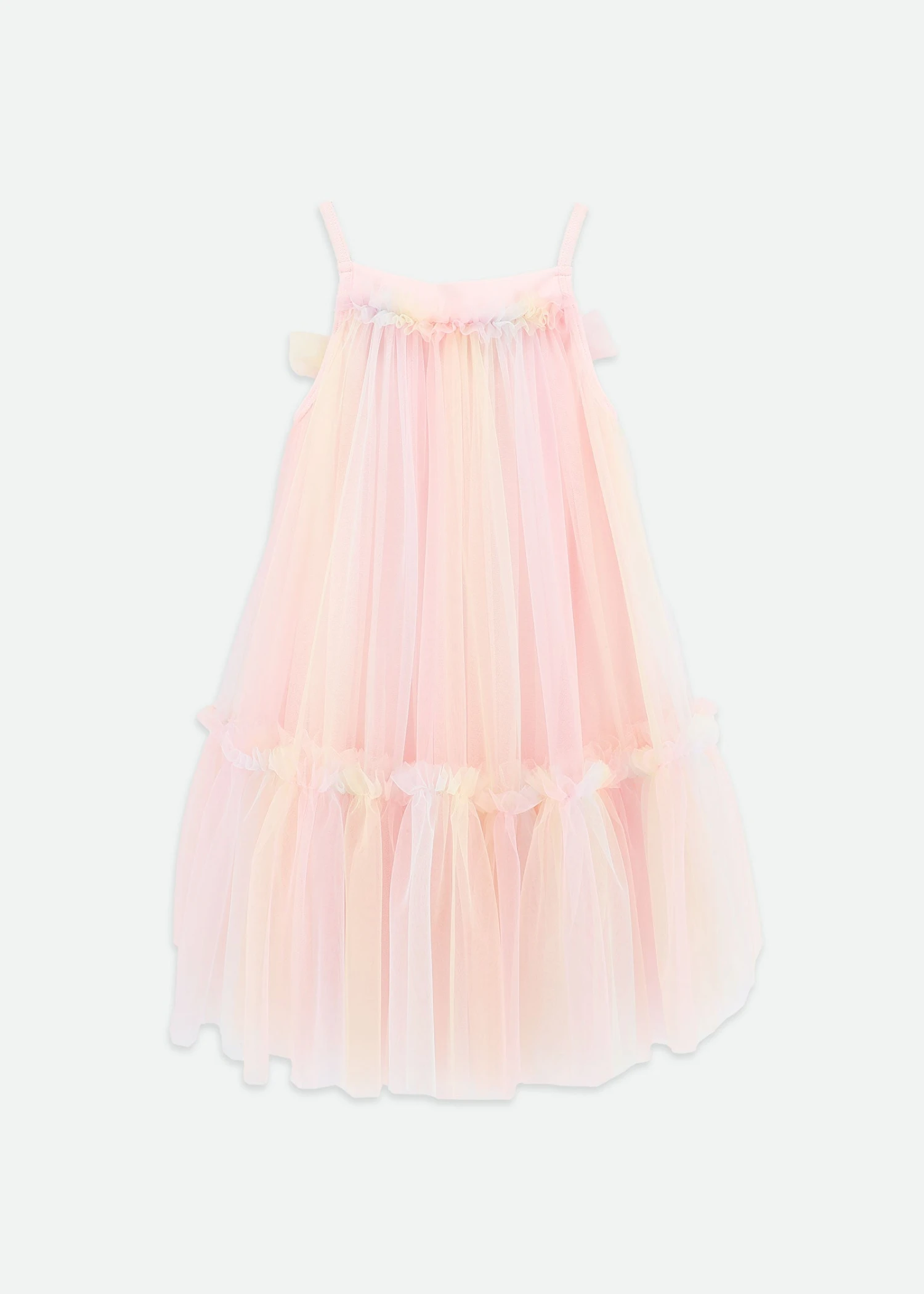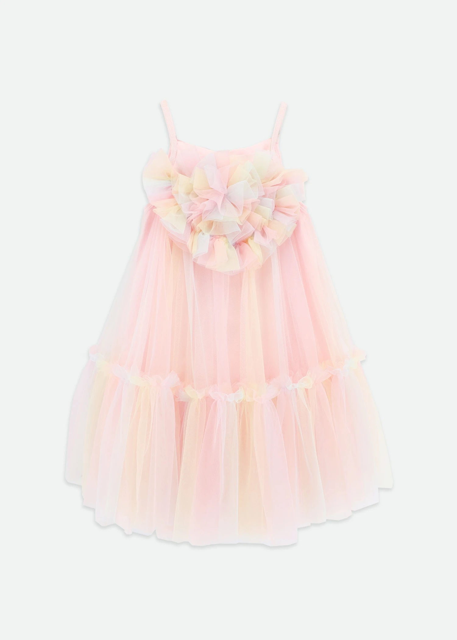 Elegant trapeze sundress made in soft tulle with rainbow effect for girls. Detailed with a tulle rosette on the chest and a ruffled trim around the skirt. Fully lined in a super soft cotton to ensure it is comfortable against delicate skin.