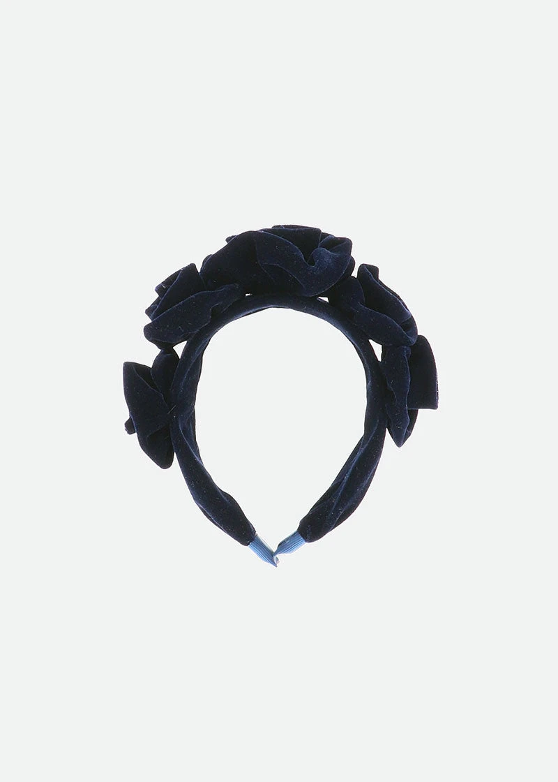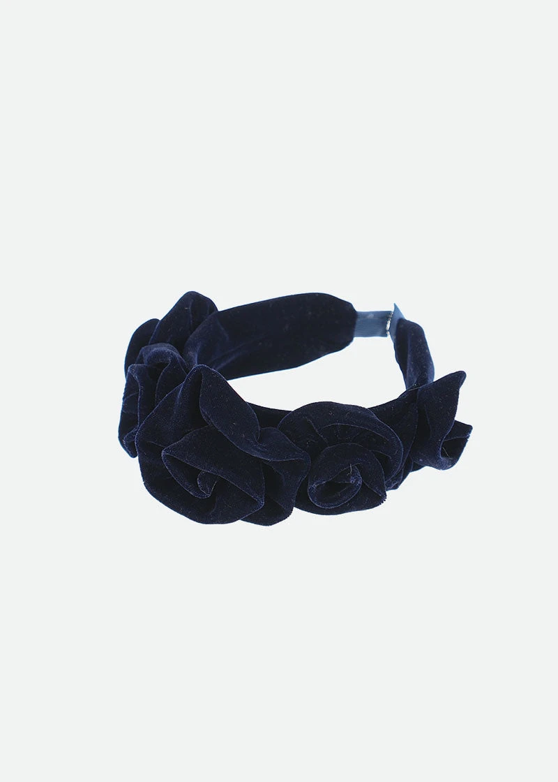 Add a luxury finish to any outfit with our velvet Rosie headband. Three navy blue roses to frame the face of your stylish angel.