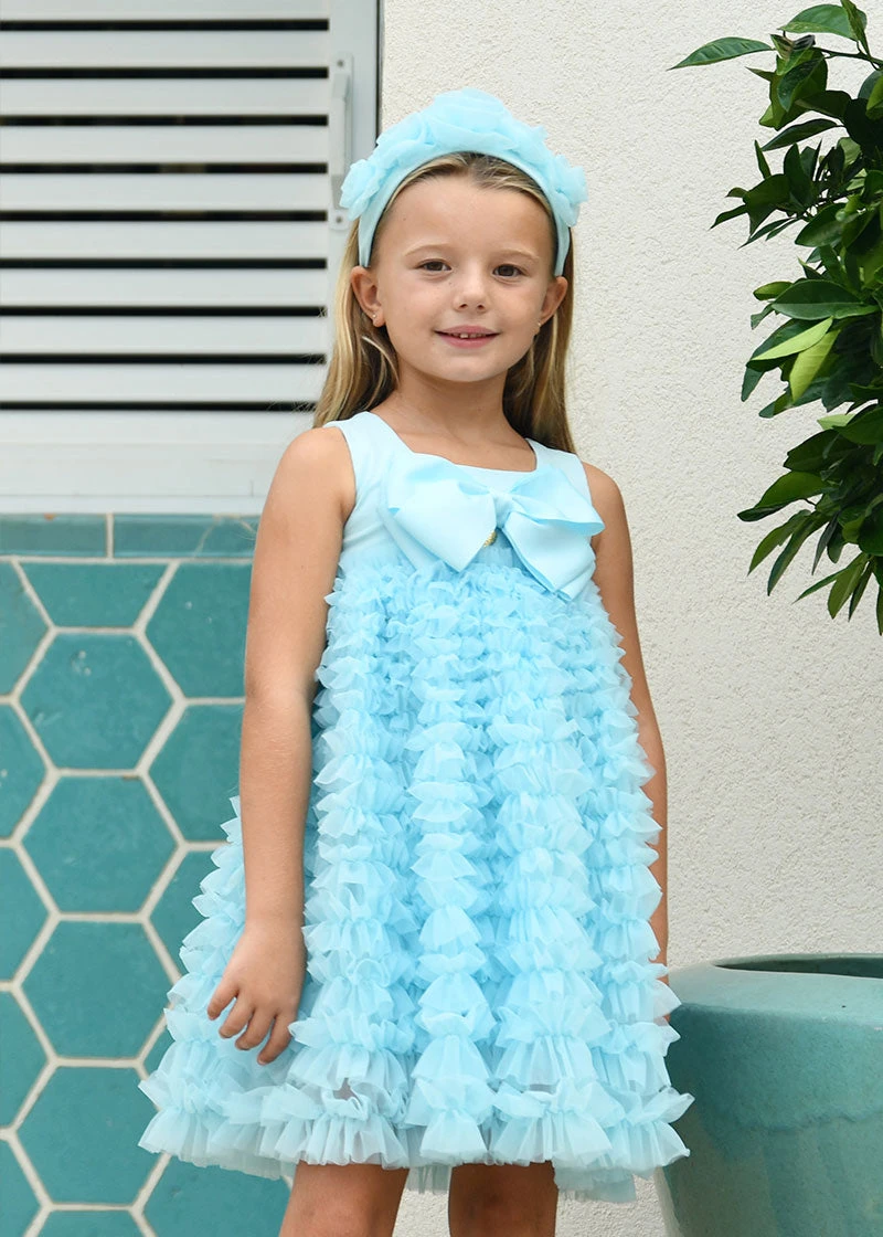Add a luxury finish to any outfit with our tulle aqua headband with a soft jersey base. Featuring three matching roses to frame the face of your stylish angel.