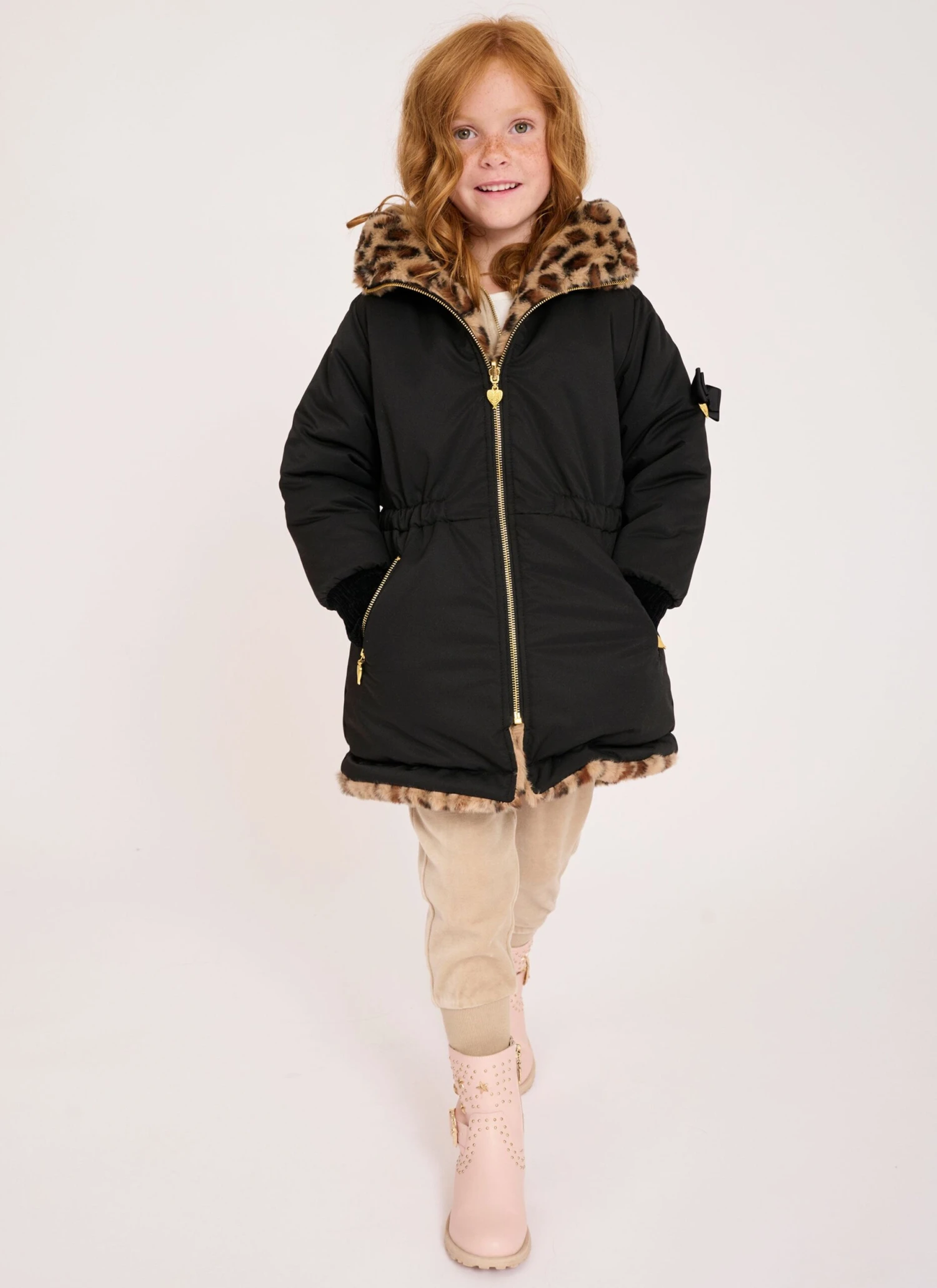 Keep cosy in our reversible faux fur winter coat for girls. The coat has a luxurious black outer shell with a reversible faux fur leopard side. The coat features an elasticated waist, handy pockets and deep warm cuffs. Our signature bow and gold heart charm features on the sleeve.