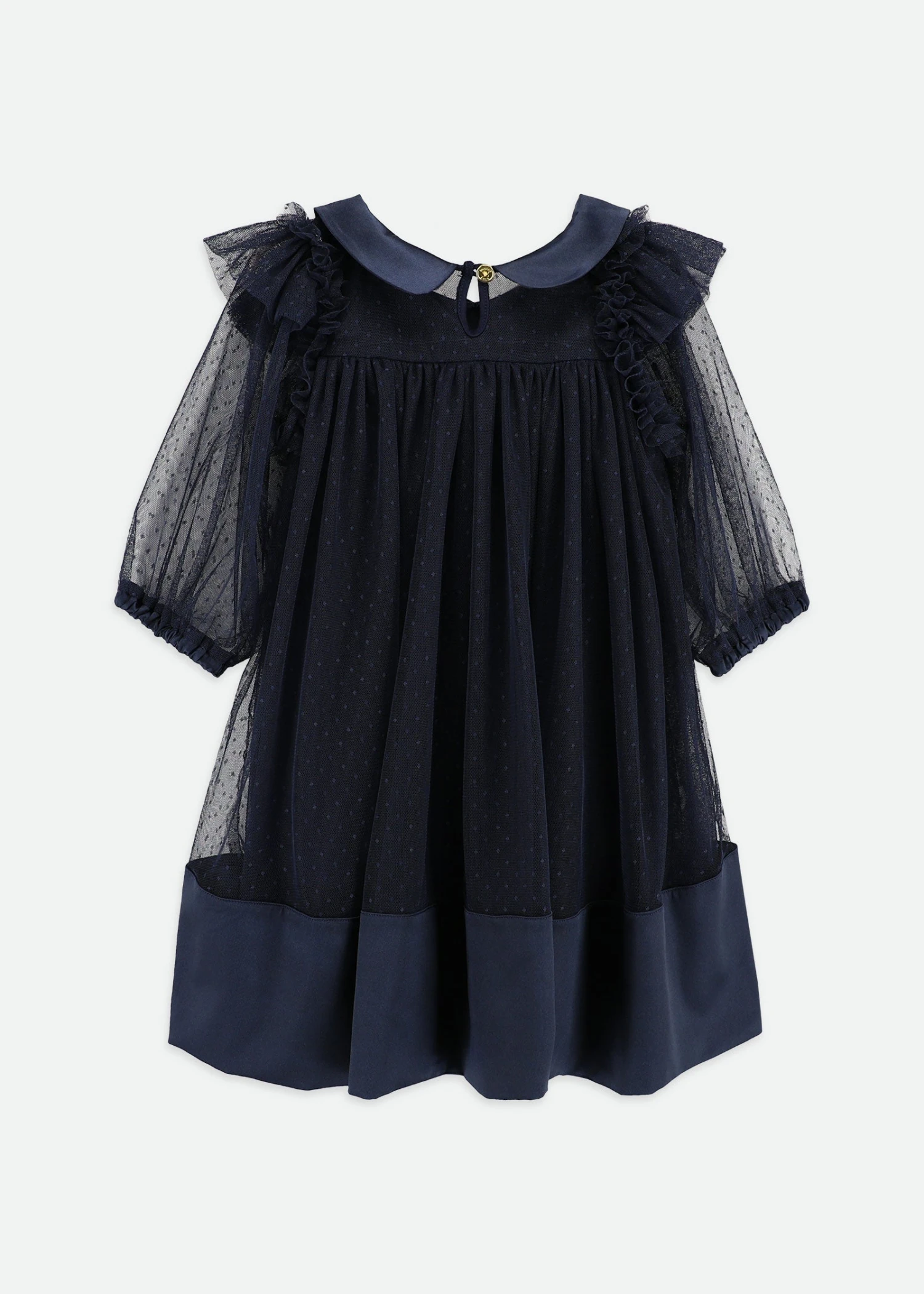 Navy Polka dot peplum dress with a beautiful satin collar and rose. The sleeves are sheer and cuffed with satin at the wrist. This dress features an elegant satin hem and is fully lined with a soft cotton blend. Fastening at the back with a gold logo button.