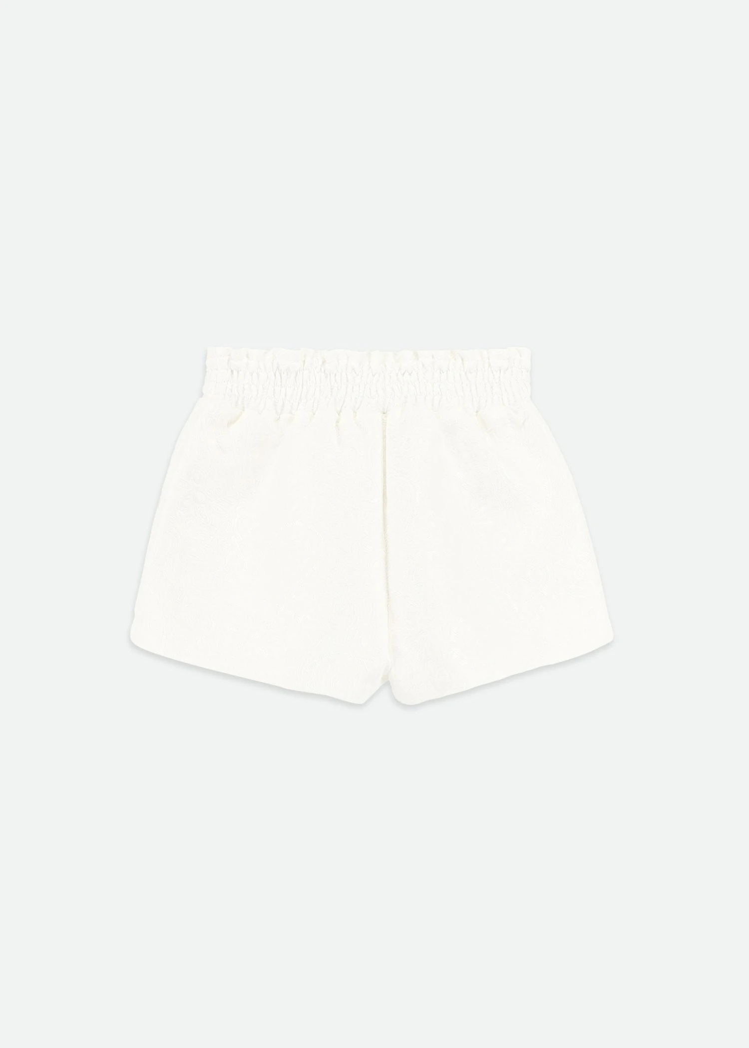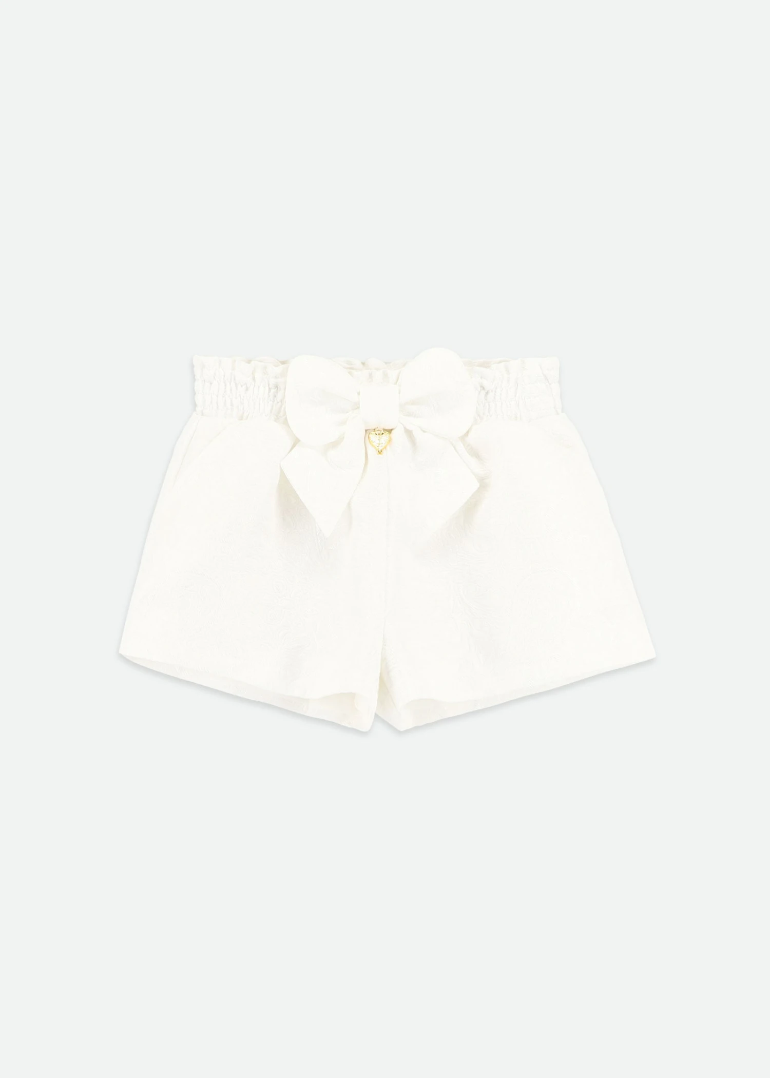 Dazzling Jacquard shorts in snowdrop with a ruched paper bag waist. Full-lined in soft fabric for extra comfort. Complete with a Self-fabric bow and gold heart charm on the waist.