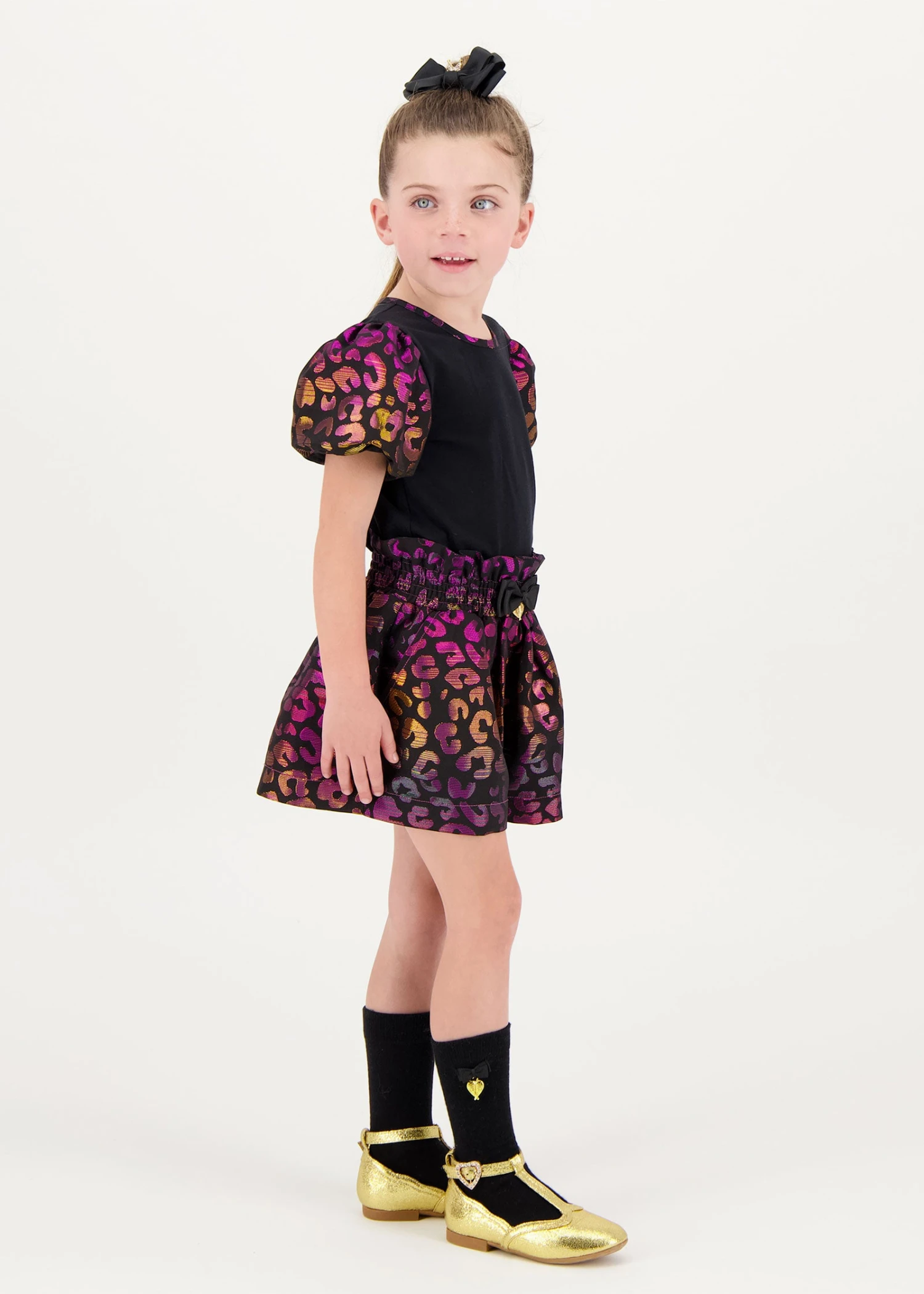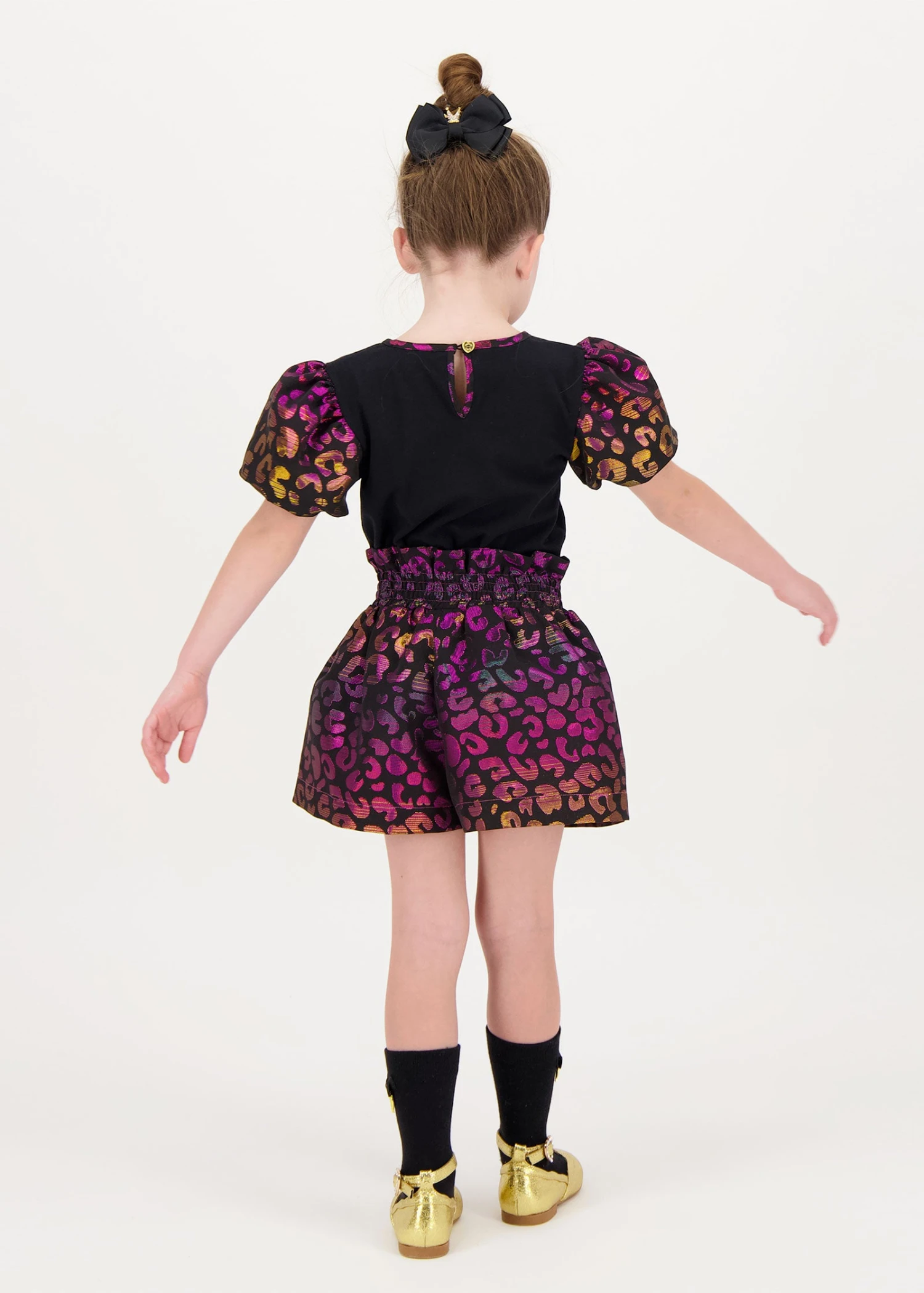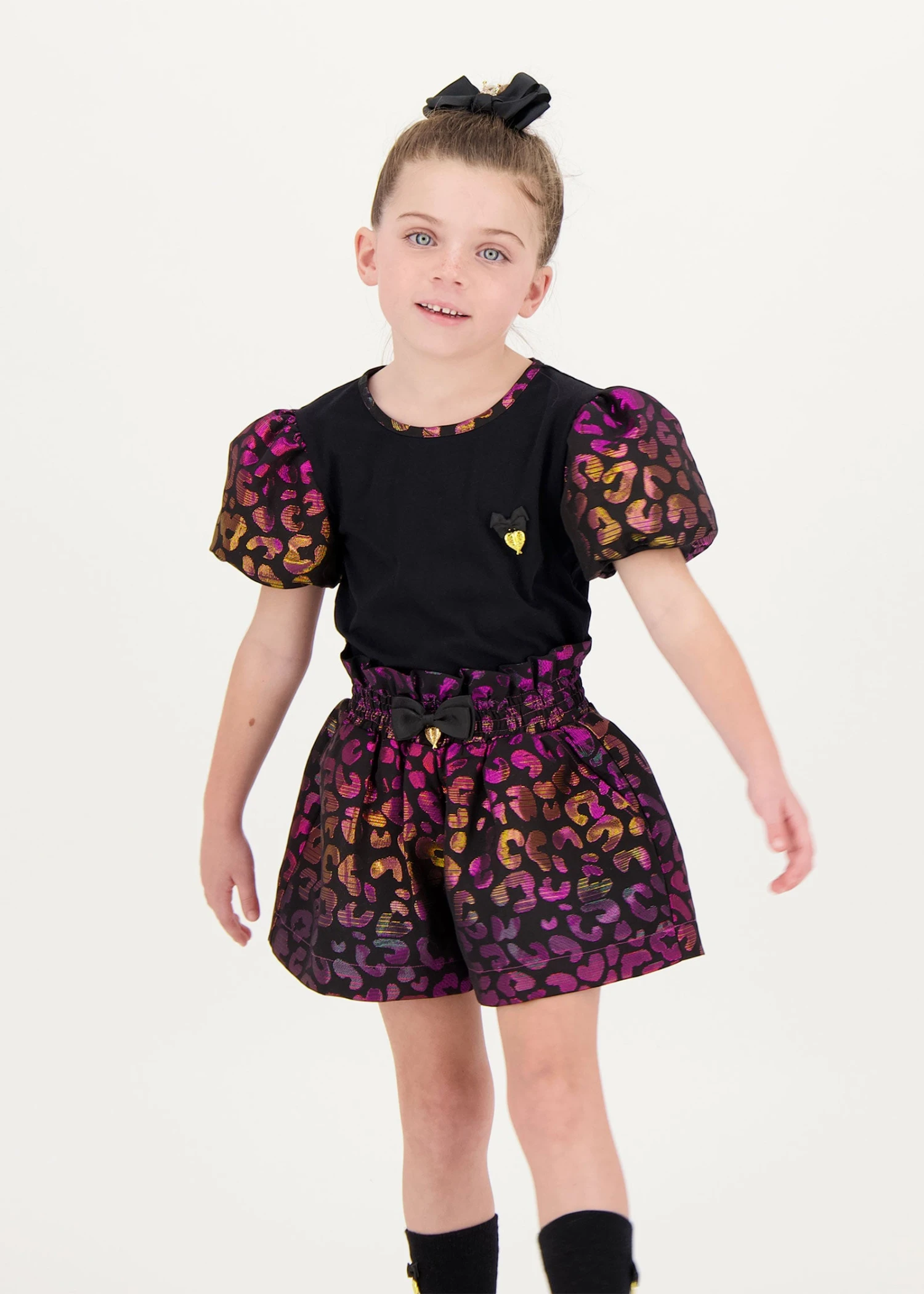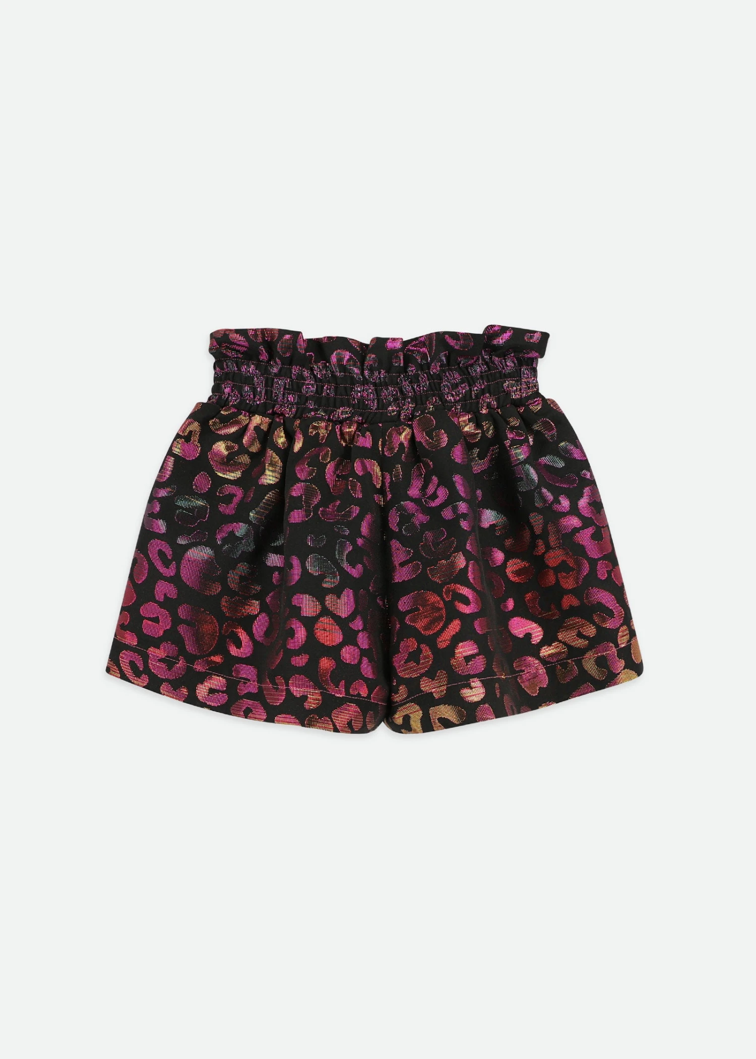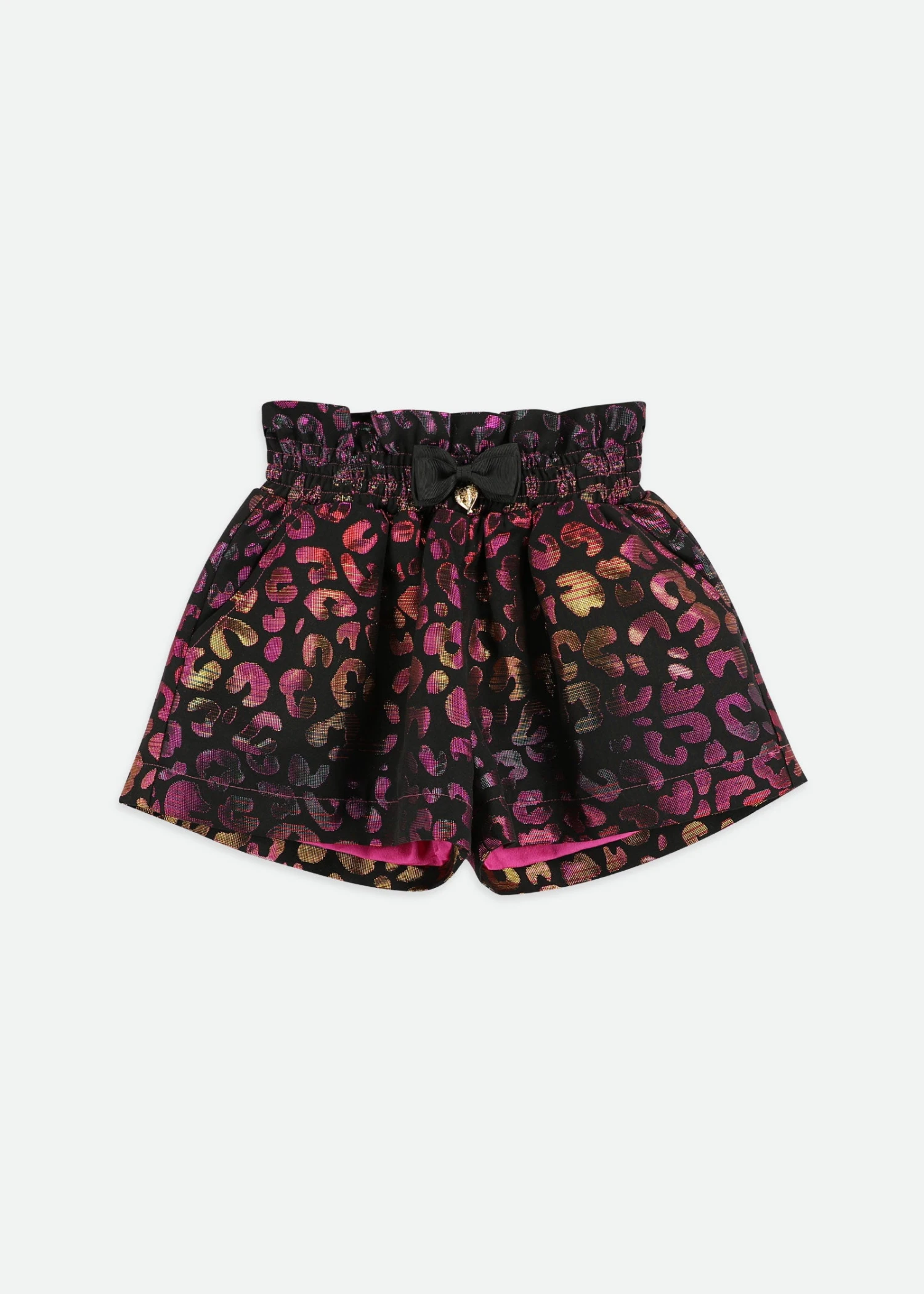 Dazzling metallic shorts in leopard with a ruched paper bag waist. Full-lined in soft fabric for extra comfort. Complete with a signature bow and gold heart charm on the waist.