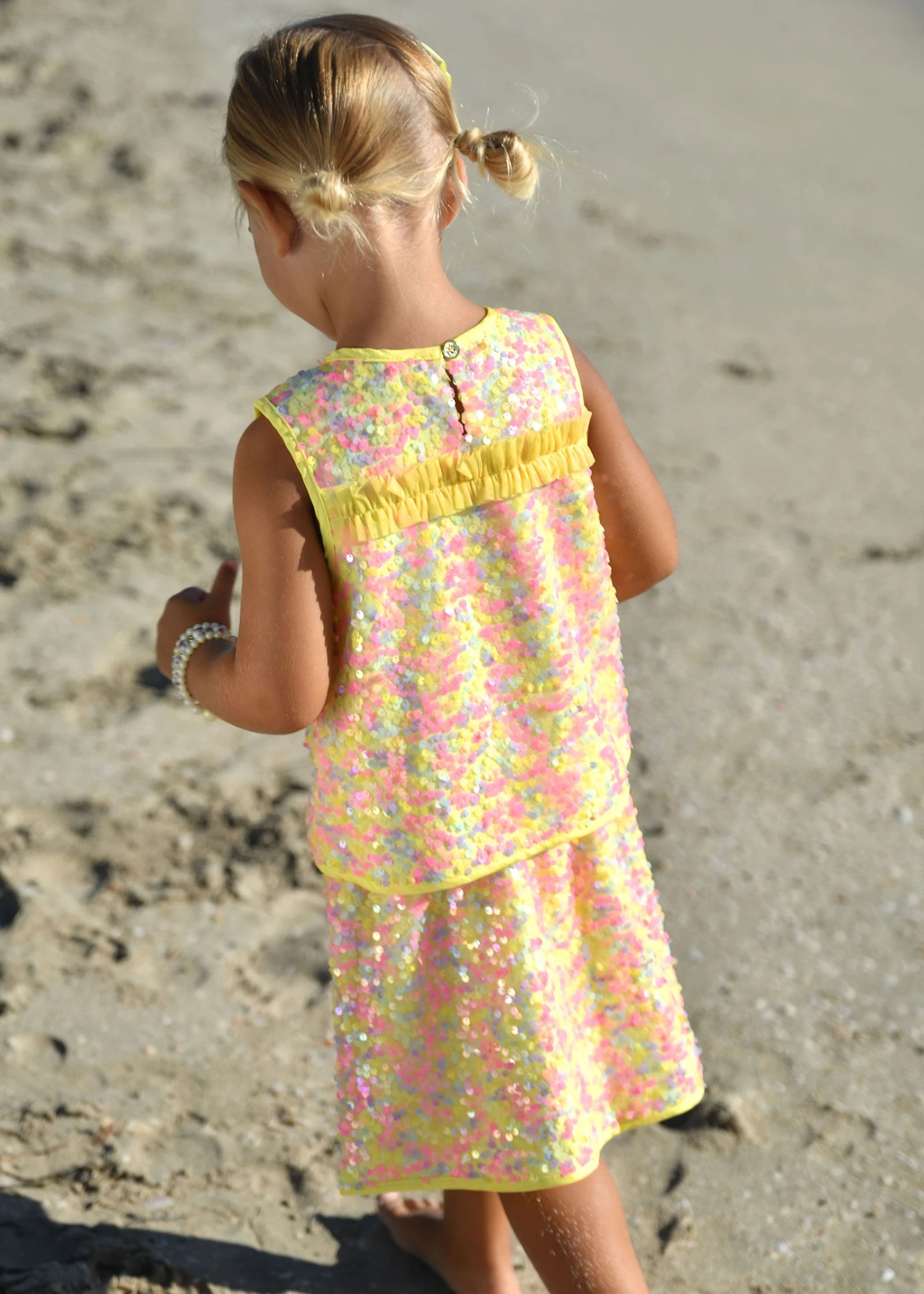 Stunning sherbert sequin pull-on skirt for girls. An elasticated skirt that is bound in a soft jersey for comfort. The waistband has a grosgrain bow and signature gold heart charm. The skirt is fully lined and sits above the knee.