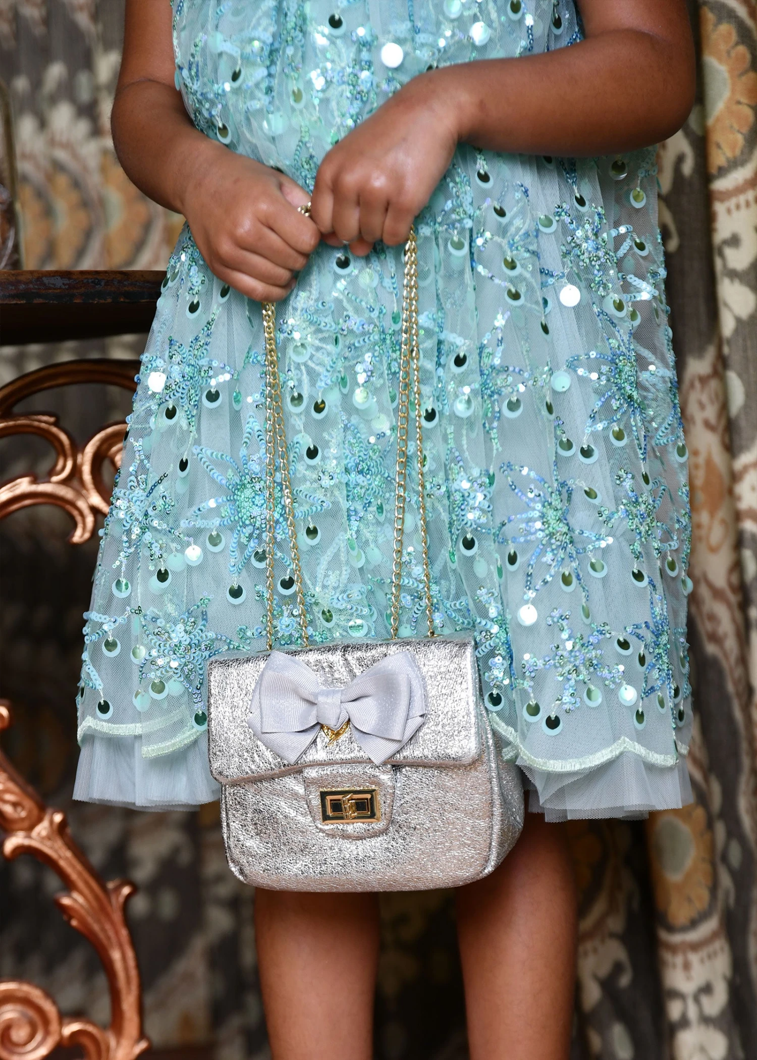Stylish silver metallic shoulder bag featuring our signature bow and gold heart charm on the front. Bag is fully lined with a handy zip pockets and has an adjustable chain for shoulder or cross body look, perfect finishing accessory.