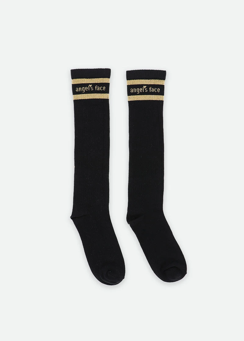 Sporty black and gold Angel’s Face branded knee-high socks.
