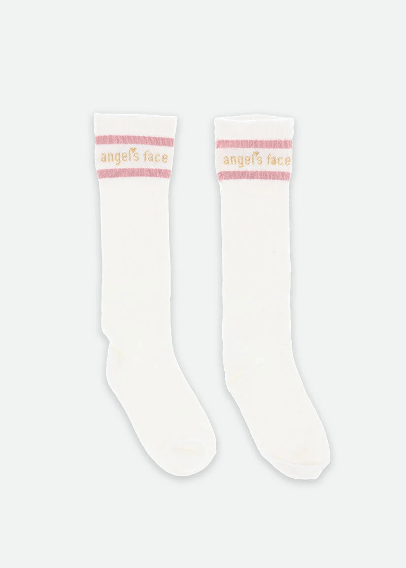 Sporty snowdrop and pink Angel’s Face branded knee-high socks.