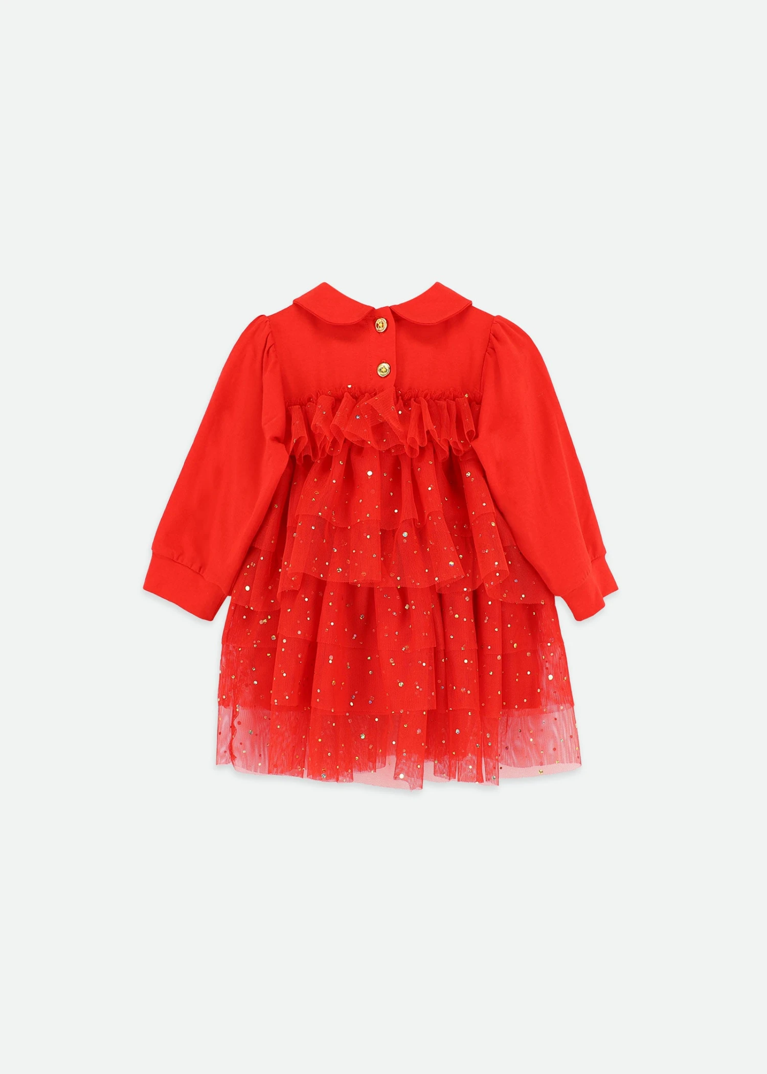 Gorgeous red special occasion dress for baby girls. Pleated tiers of luxurious gold dot tulle create a voluminous skirt featuring our signature bow below the collar. Dress is made from a soft stretch cotton blend fully lined with long sleeves and a cute peter pan collar. Easy changes with a back neck opening secured by gold logo buttons.