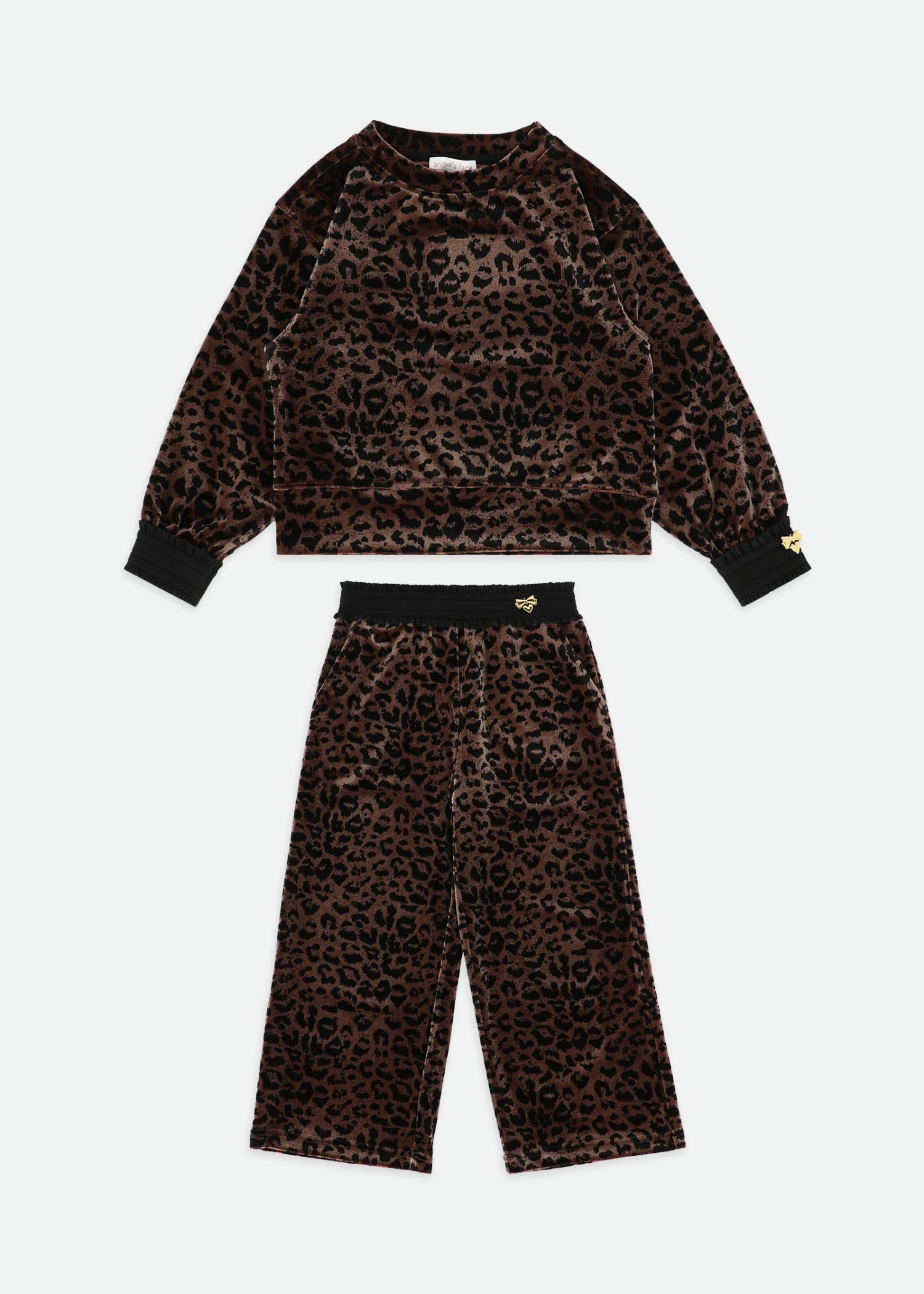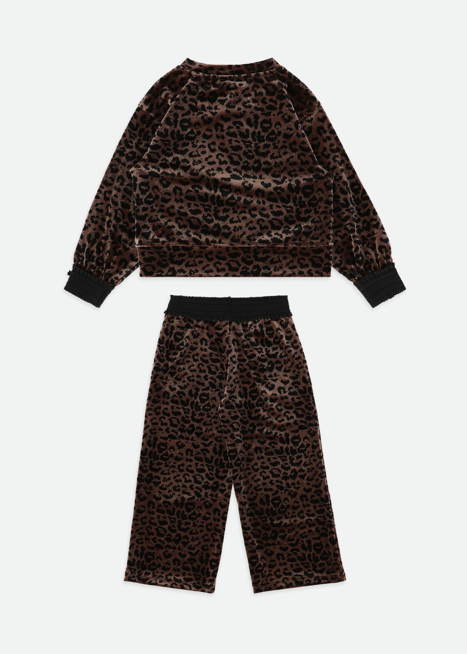 Luxuriously soft velour set in leopard. Detailed with glamorous black ruffled cuffs and waistband. This set is designed with a relaxed top and wide-leg trouser. The set is finished with our signature bow and heart sud on the waistband and sleeve.
