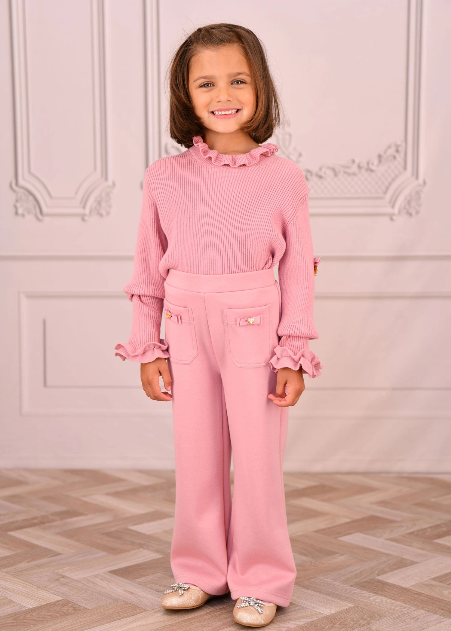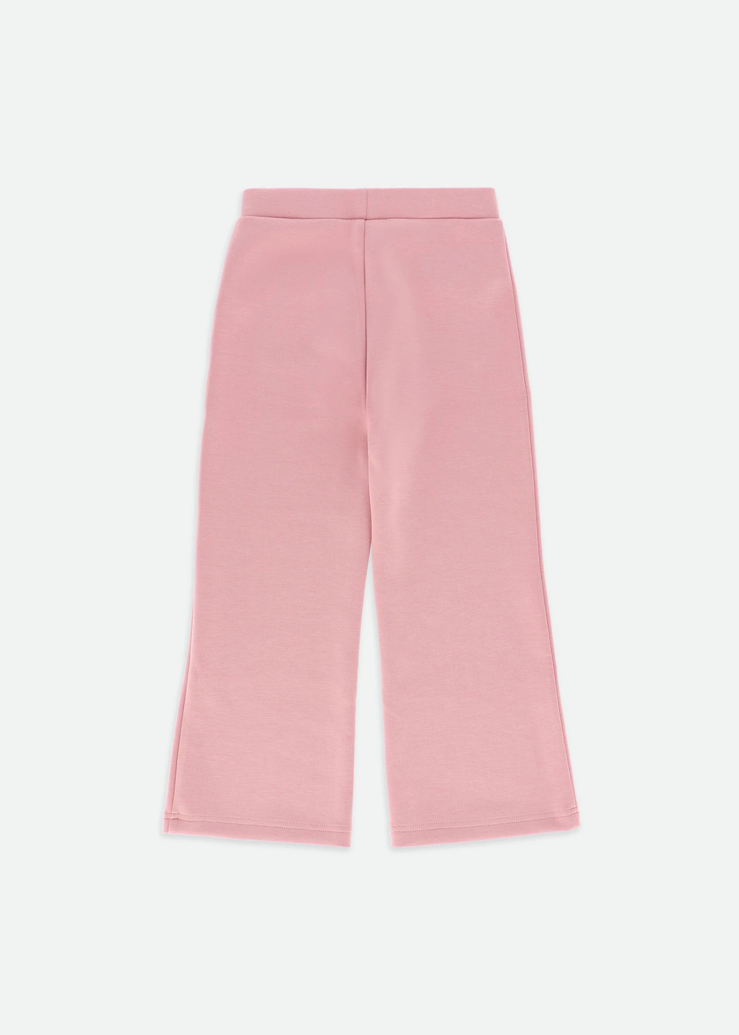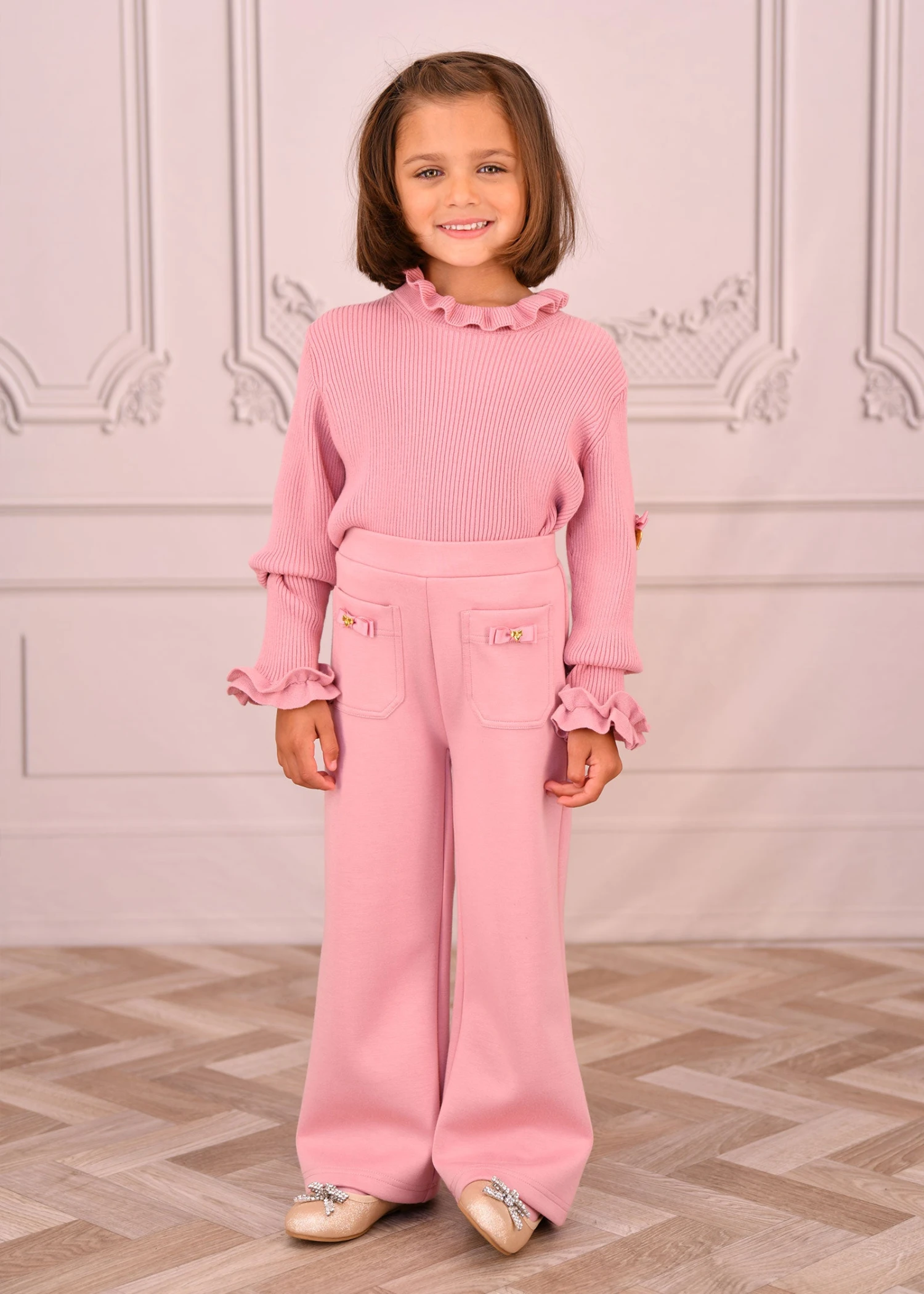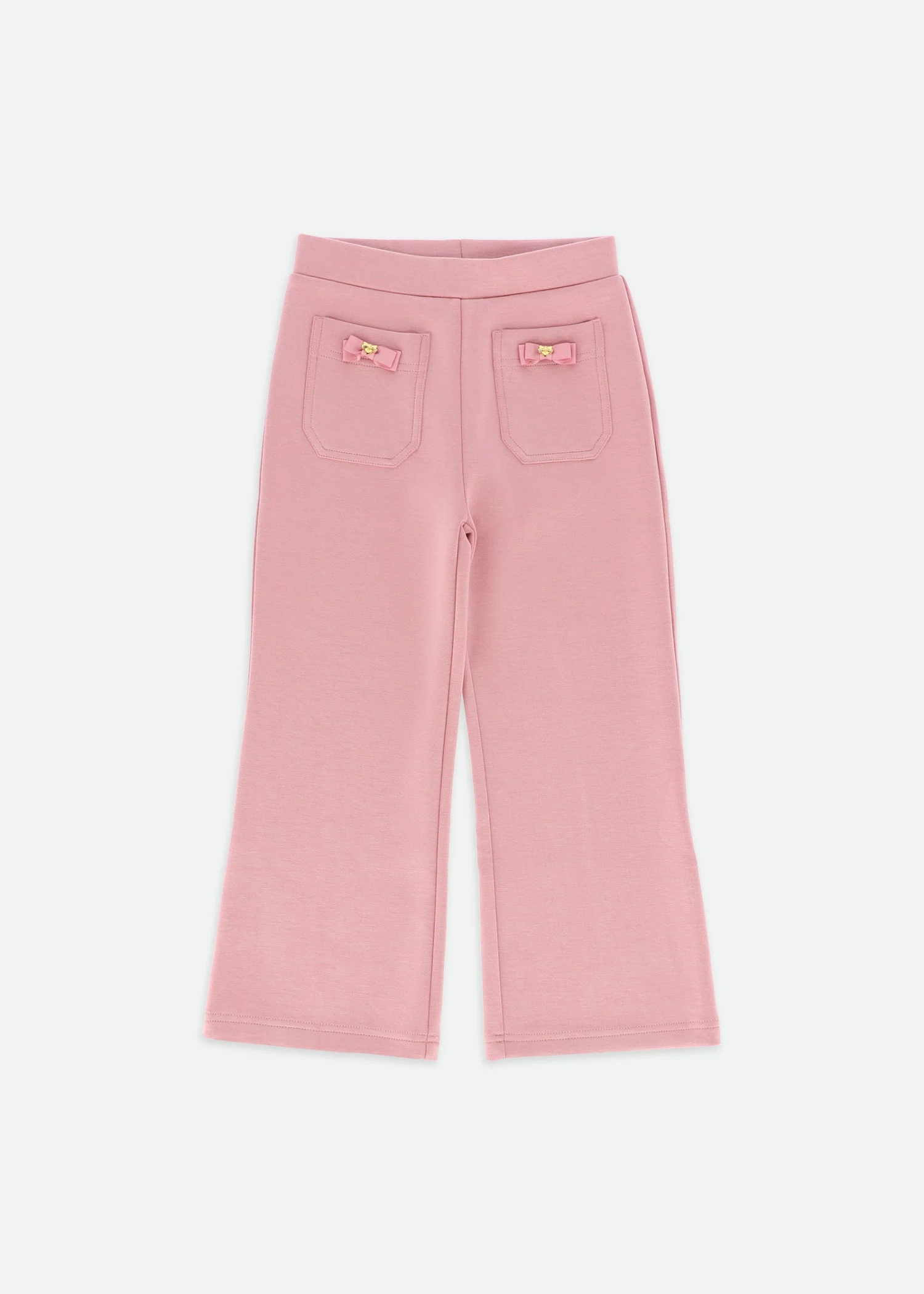 These soft, relaxed tea rose wide-leg pants for girls are the ultimate in comfort and style. Featuring a comfortable elasticated waistband and straight-leg design, making them versatile for both dressing up or down. The front is detailed with two pockets, each adorned with our signature bow and logo stud for a touch of elegance.