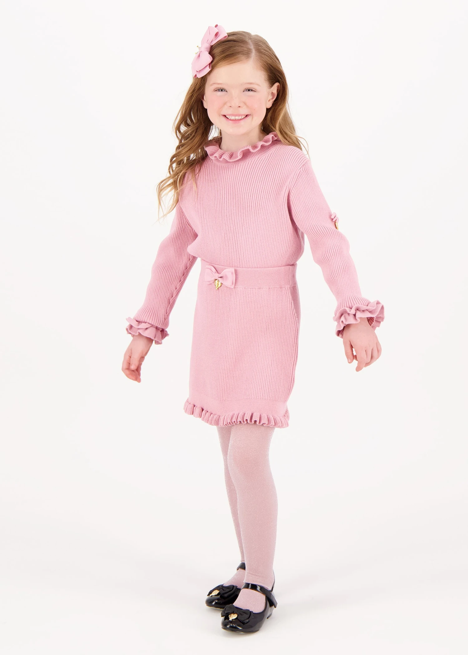 Girls Cotton Rib Knitted skirt in Tea Rose. Pairs perfectly with our Elma Jumper for a chic co-ord look. With a soft stretch elasticated waistband and is finished with our signature bow and gold heart charm on the waist.