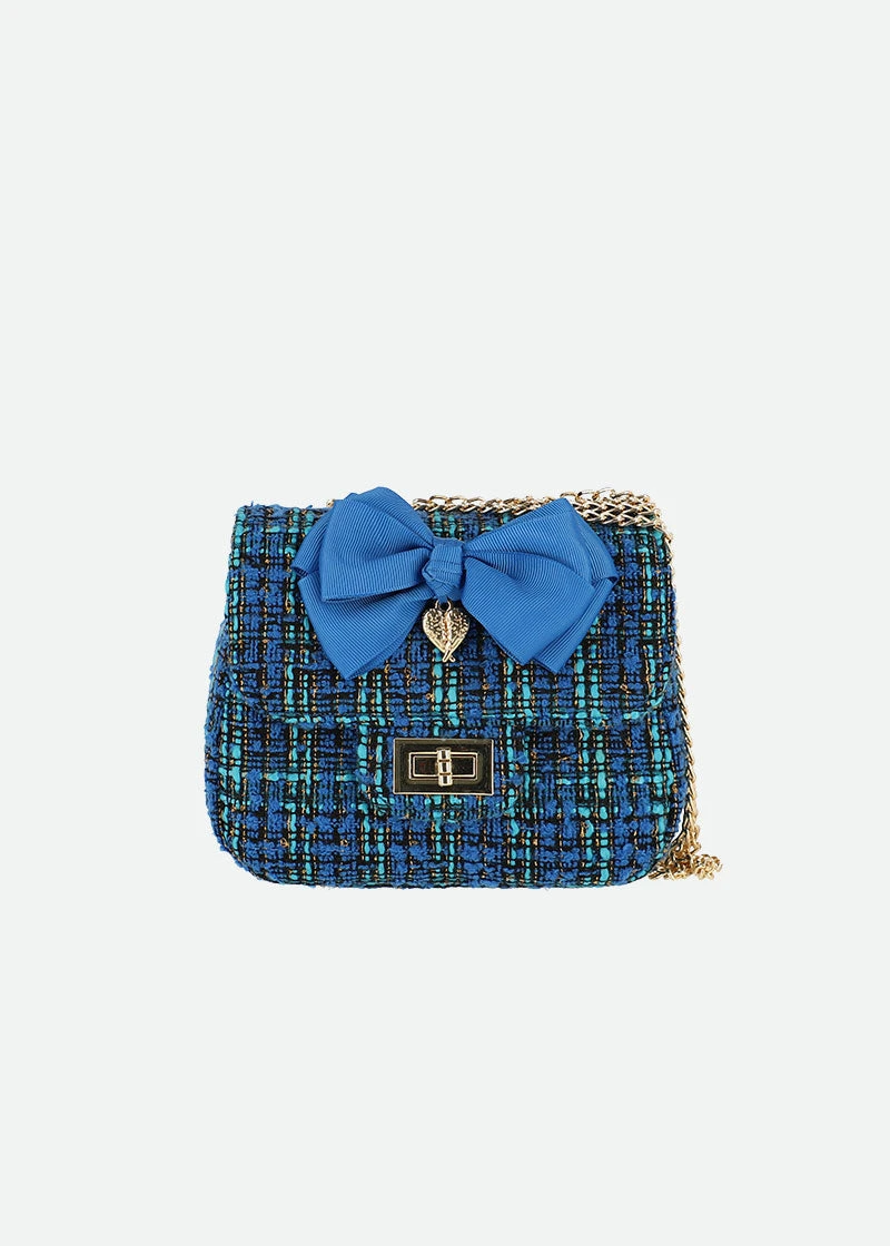 Our Tweedy bag is the perfect accessory for your party queen. This stylish bag in vibrant tweed, features our big bow and signature gold heart charm on the front. Fully lined including a handy zip pocket to store those small everyday essentials. Wear the bag however fits your outfit, the gold chain can be worn on the shoulder or across the body.