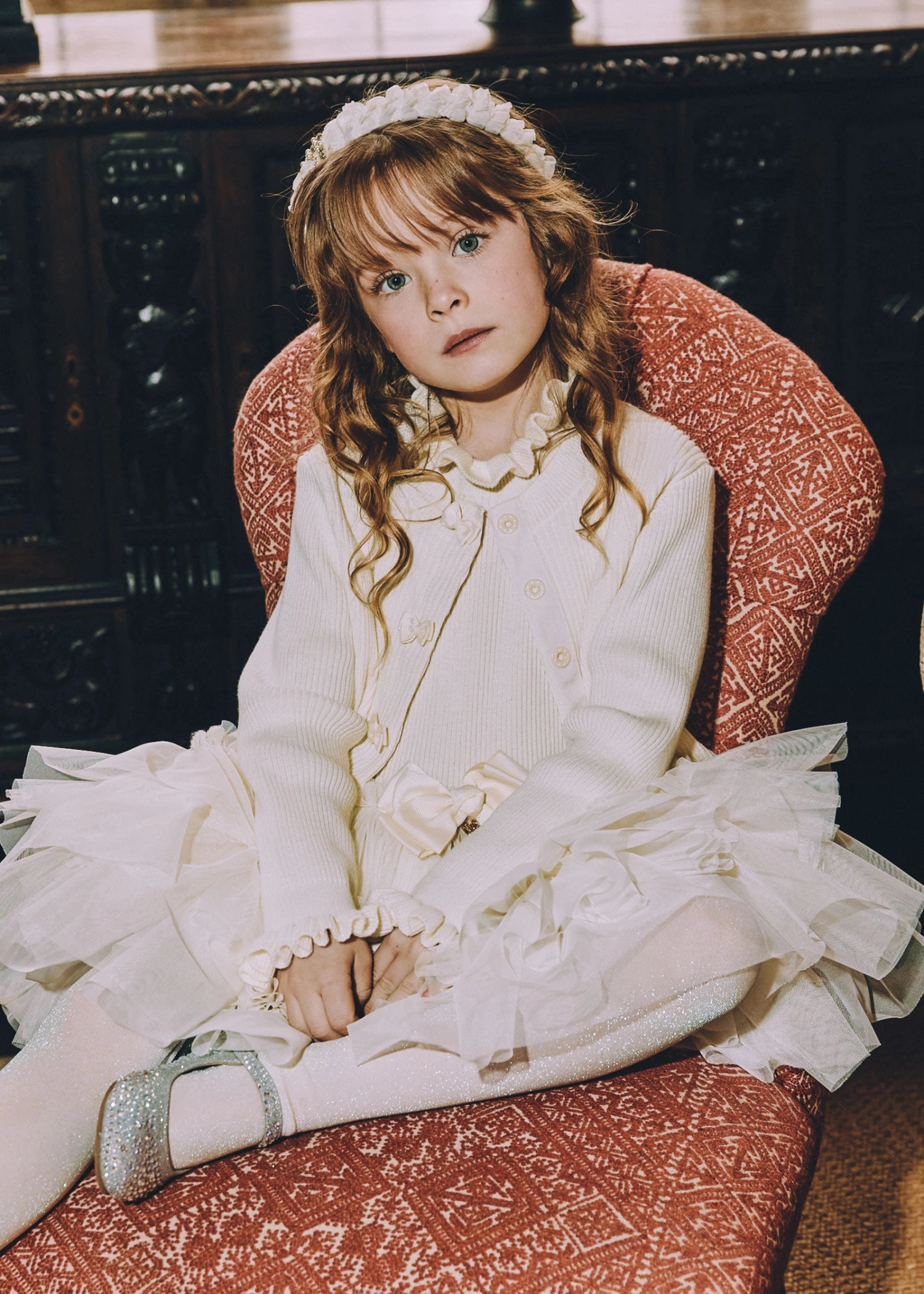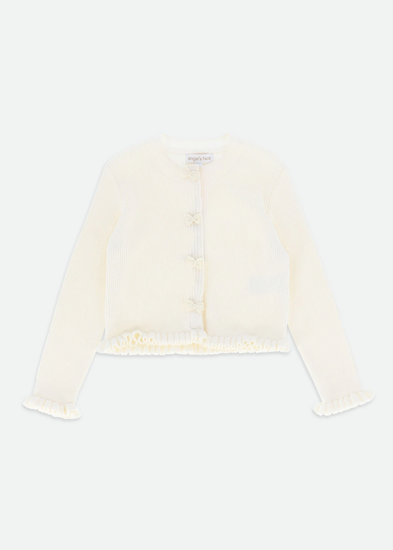 Sweet Ribbed Vanilla Cardigan for girls. Designed in the softest cotton knit, this cardigan is edged with a fabulous frill on the waist and cuff. Fastens at the front with cute bow press studs.