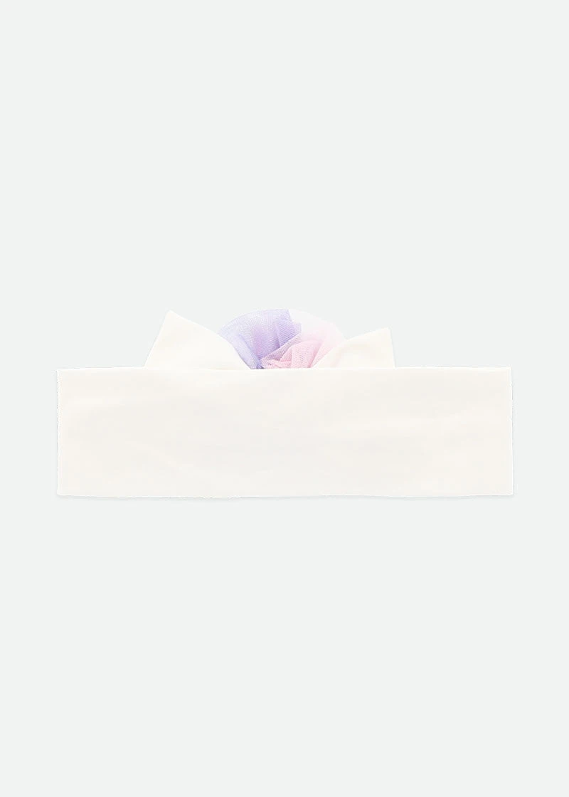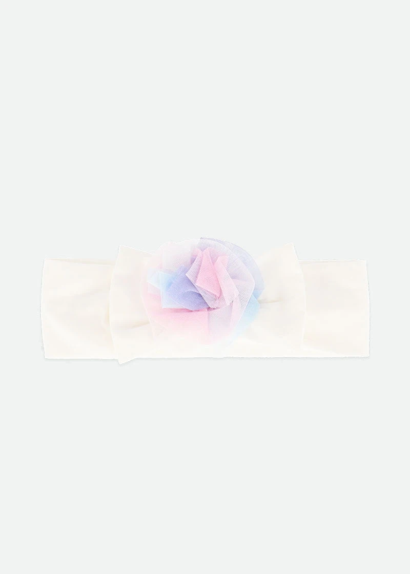 Soft and stretchy swimwear headband in snowdrop white. Headband features a decorative bow and multi colour tulle flower, the perfect swim accessory.