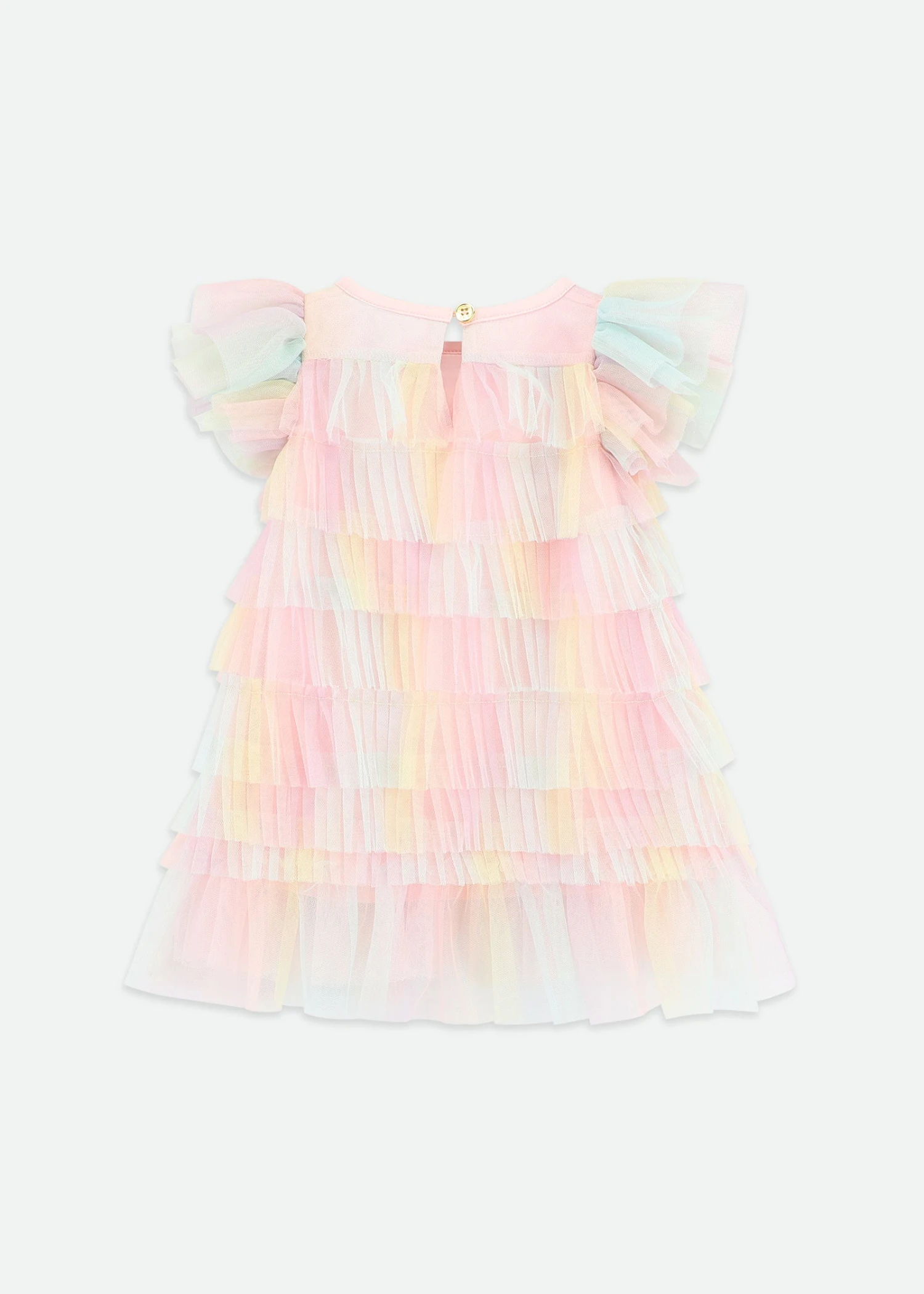Beautiful dress for baby girls in rainbow. Featuring wonderful waterfall ruffles and tiers of tulle lined in soft material for extra comfort. The look is complete with our signature bow and gold heart charm in pink.