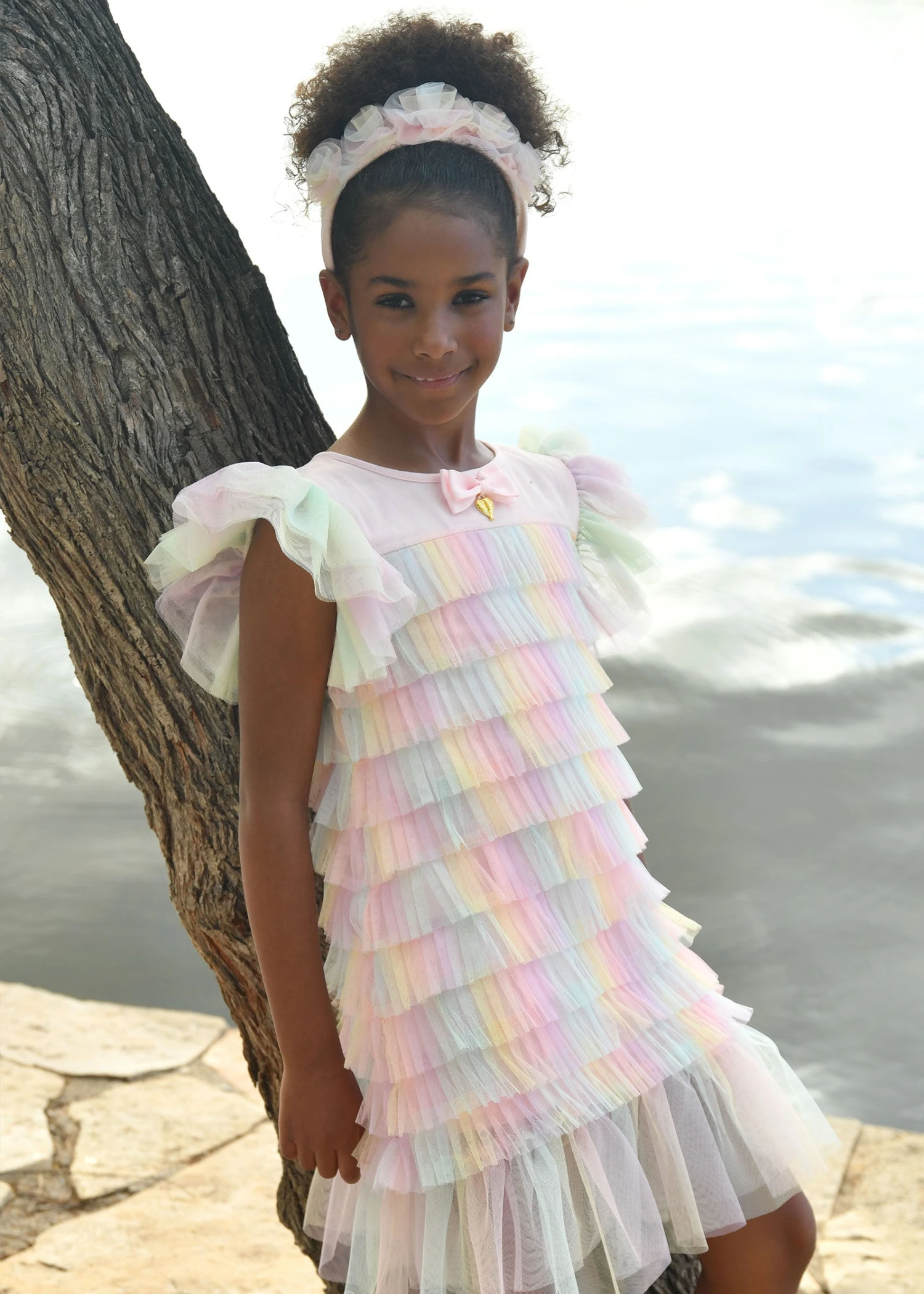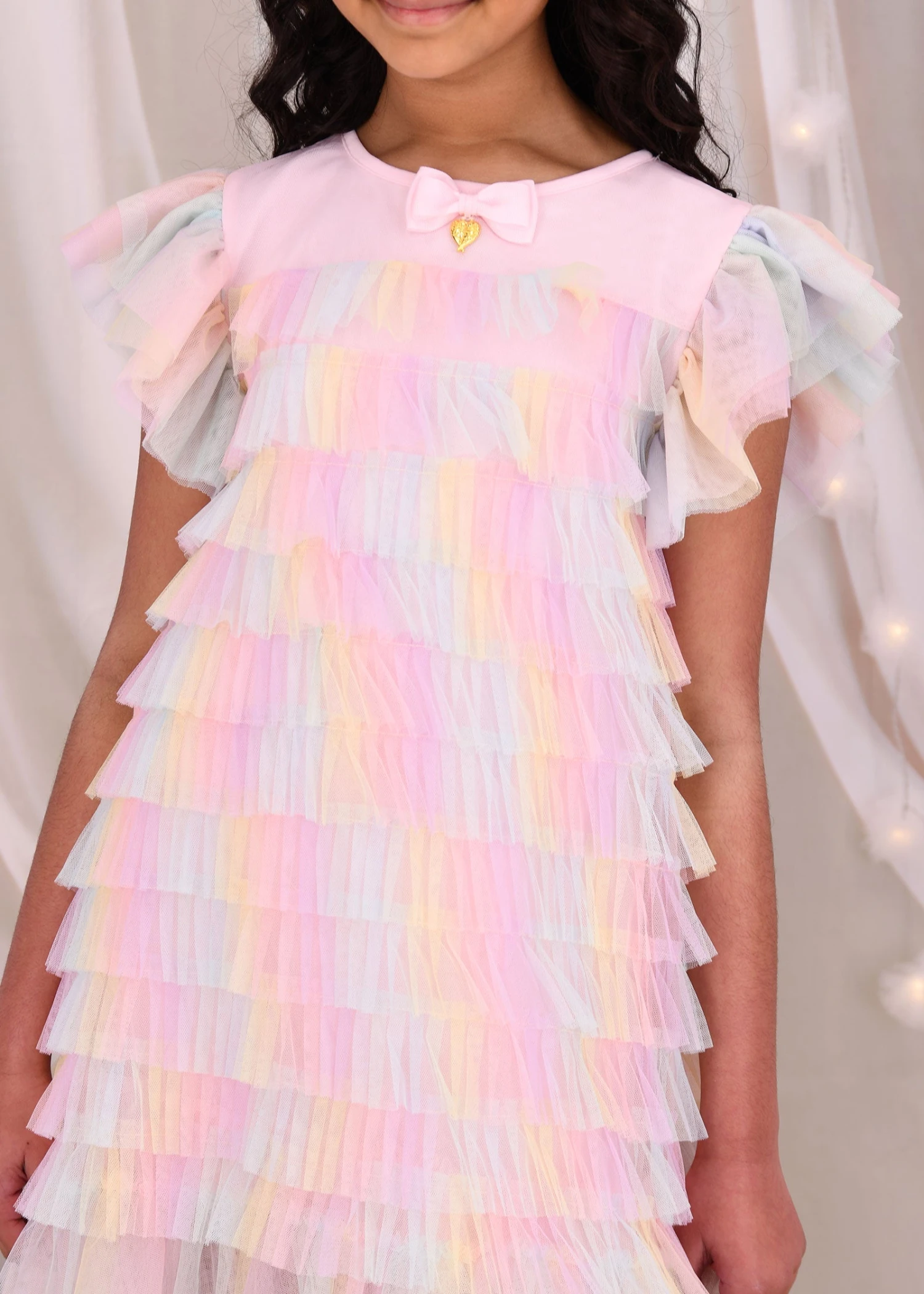 Beautiful dress for girls in rainbow. Featuring wonderful waterfall ruffles and tiers of tulle lined in soft material for extra comfort. The look is complete with our signature bow and gold heart charm in pink.