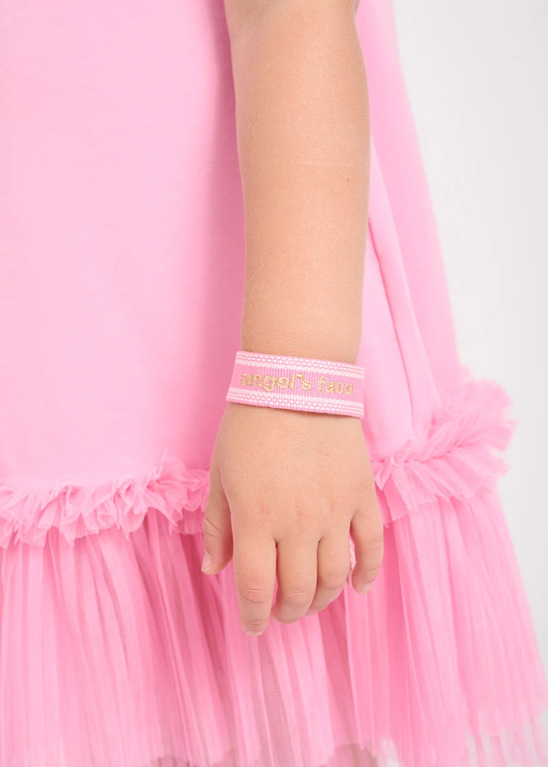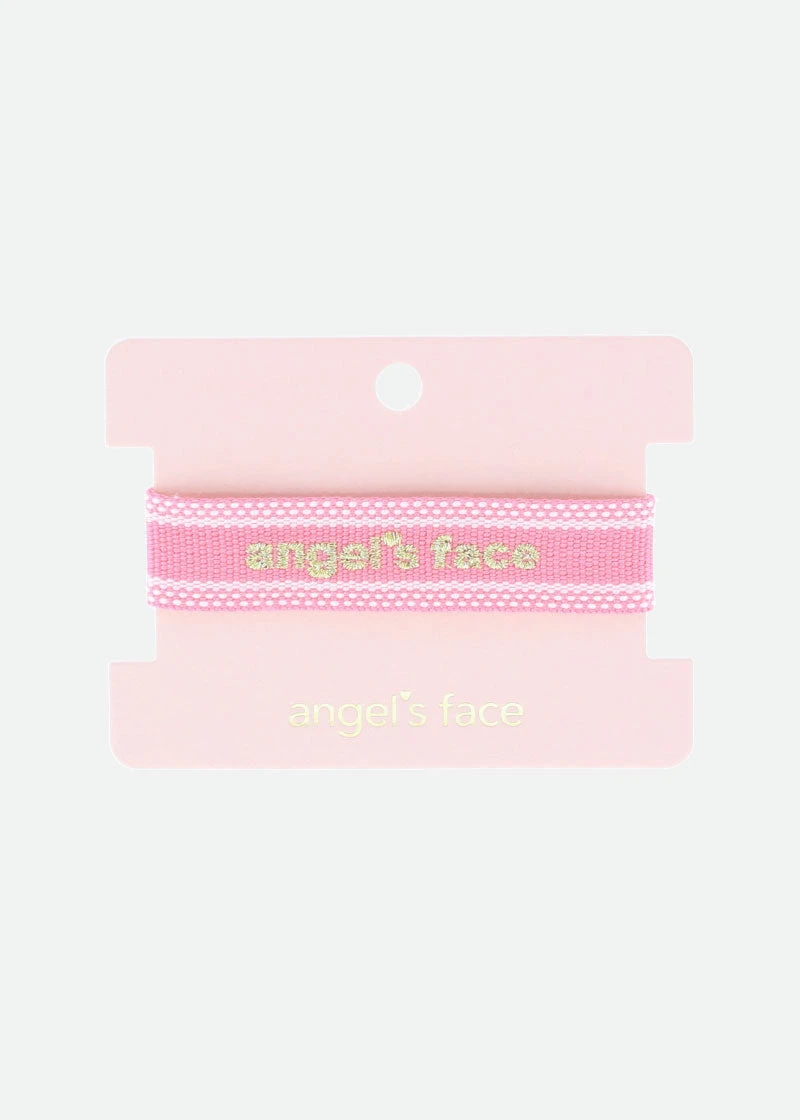 Pretty Woven Logo Bracelet for Girls. The bracelet features Angel’s Face logo in pink and gold thread and size of bracelet can be adjusted with an easy draw string fastening.