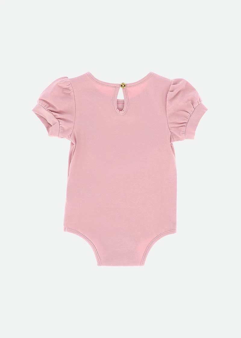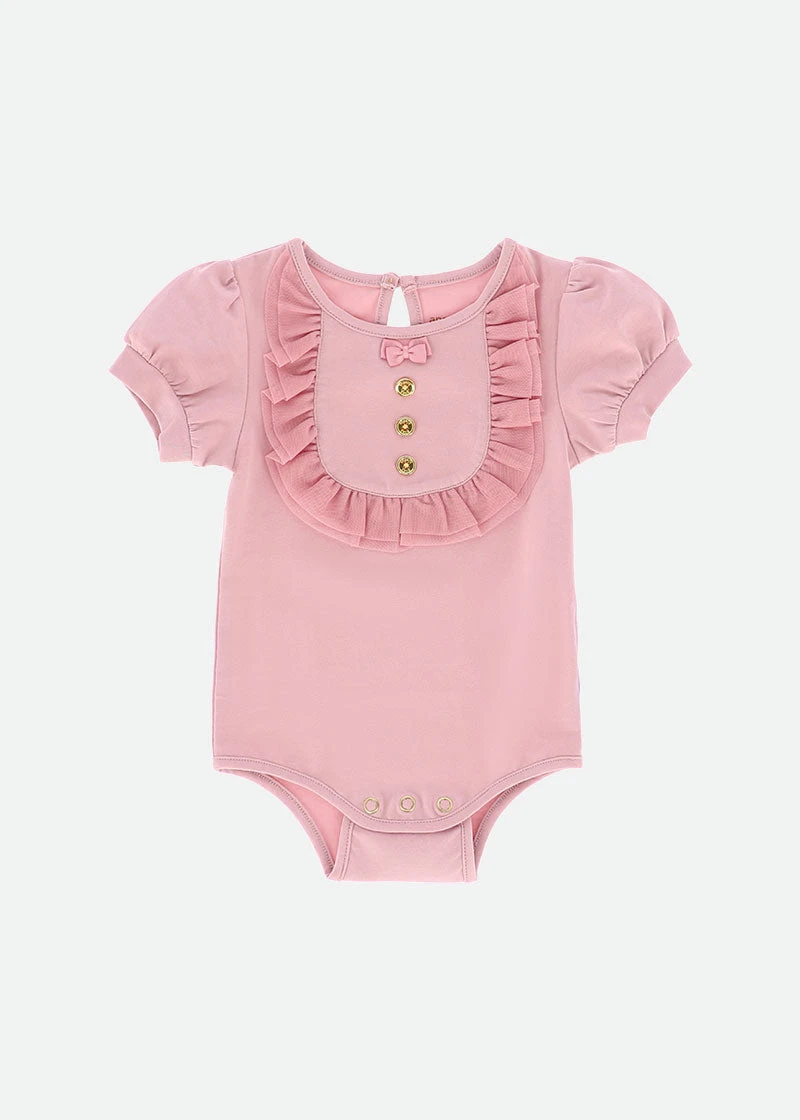 Gorgeous pink baby grow with short capped sleeves made from the softest stretch cotton. Designed with an adorable bib edged in tulle ruffles featuring our signature bow centre of the neckline. Babygrow fastens with a button at the back neck and comfortable poppers at the crotch.
