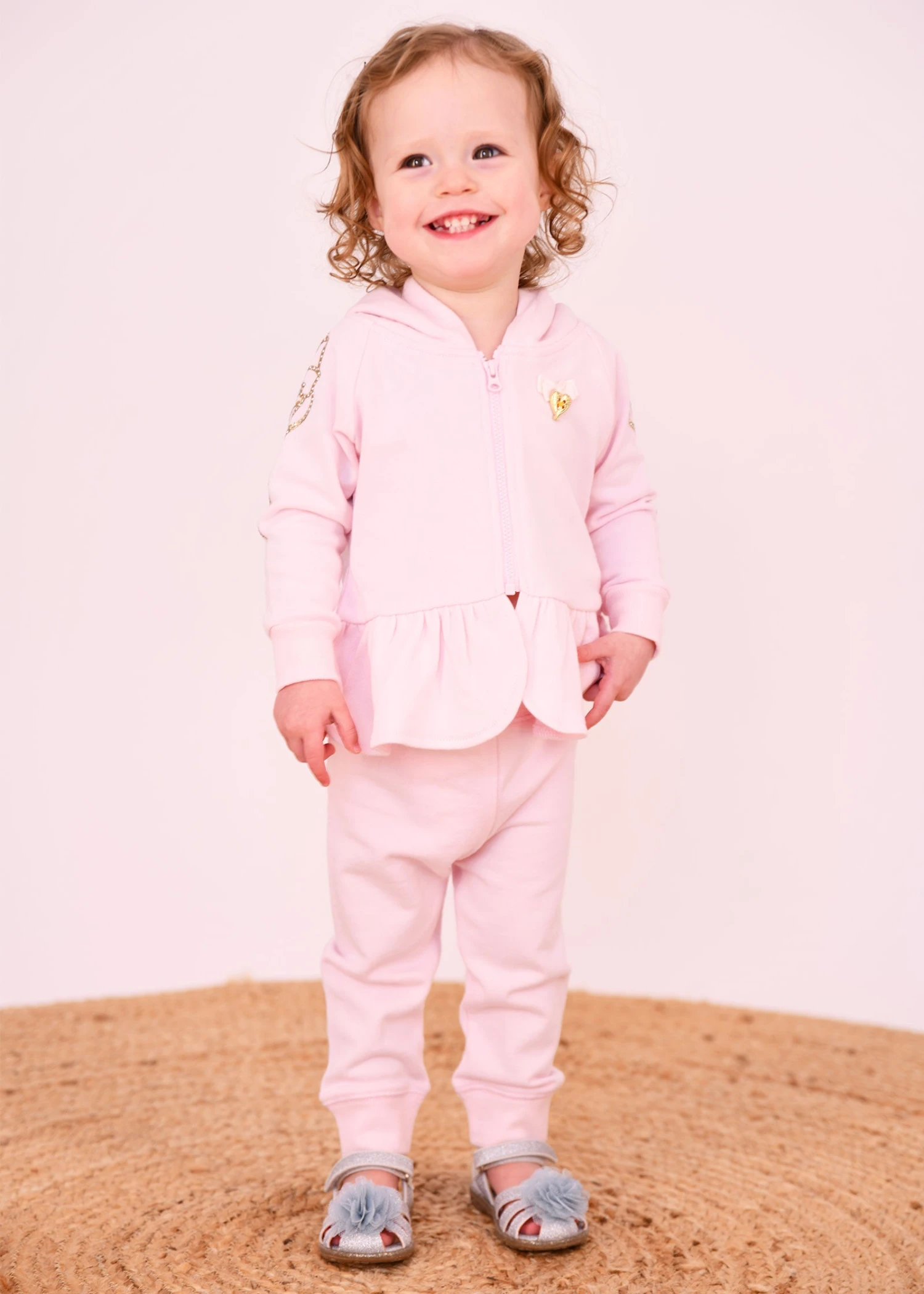 Our adorable mini-me, soft cotton, Zeta tracksuit is the perfect set for your little one. The zip up hoodie features a pretty peplum hem and iconic wings on the sleeves. Soft stretch waist and cuffs allow extra comfort on the slim fit bottoms. Both pieces complete with our signature bow and gold heart charm secured safely on the chest and waistband.